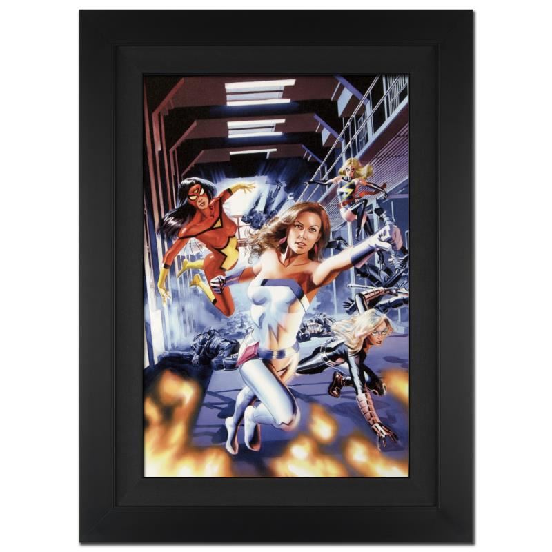 A piece of comic book history, this limited edition, from original art by Mike Mayhew, depicts the classic characters Jewel, Mockingbird, Spider Woman, and Ms. Marvel. Mike Mayhew has been a working in comics since 1992. He revolutionized interior comic art with full pencil rendering. Mike took his cover skills to Marvel where he dazzled viewers with his depictions of Mystique, Elektra and She-Hulk. "New Avengers Annual #3" is an extremely limited edition giclee on canvas by Mike Mayhew presented by Marvel Comics, hand signed by the Great Stan Lee (1922-2018) and numbered out of only 4! This piece comes custom framed and ready to hang. Includes Certificate of Authenticity! Measure approx. 29" x 40" (with frame), 22" x 33" (image).