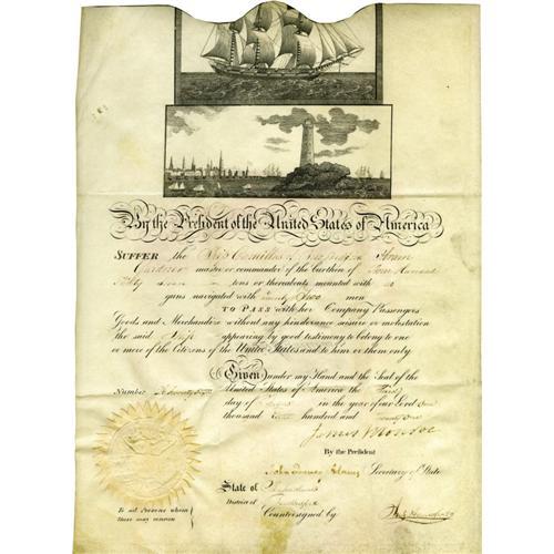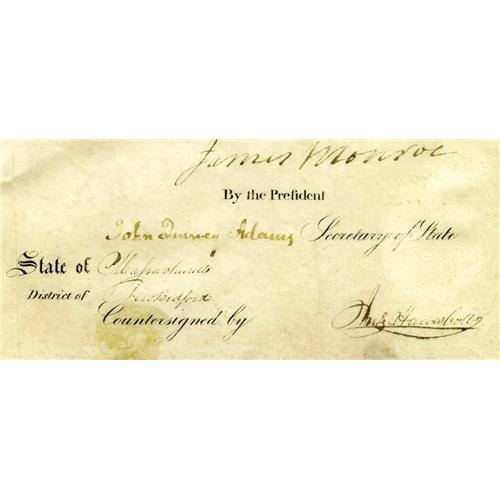 <B>New Bedford Ship's Papers With Monroe and Adams Signatures.</B></I> Document Signed on partially printed vellum. Signed "<I>James Monroe</B></I>" as president and "<I>John Quincy Adams</B></I>" as secretary of state, one page, 11.25" x 15", Washington, D.C., August 3, 1821. Papers for the ship <I>Camillus</B></I> of New Bedford, Massachusetts, attesting to her legitimacy as a merchantman of the United States. Abram Gardner is named the ship's master and the vessel is described as having "...no guns navigated with Twenty Two men...". Two maritime vignettes, one a harbor scene and the other a frigate under sail, illustrate the document. The upper engraving bleeds off the document's scalloped top edge. An embossed presidential seal is affixed to the lower left corner. An excellent opportunity to acquire two presidential signatures at once. One tiny perforation in left margin, smoothed folds with light soiling, else fine condition.