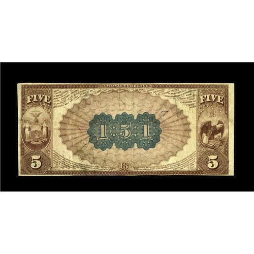 <B>New Berlin, NY</B></I> - $5 1882 Brown Back Fr. 466 <B>The First NB</B></I> Ch. # 151<BR>This issuer entered receivership in 1912, leaving a currently documented census of just eight large notes, including this nice <B>Fine+</B></I> $5 Brown Back. The example we offer here has adequate margins all around, still displays strong officers' signatures in black ink and is free from any distractions inconsistent with the assigned grade. Any collection of New York Nationals will be immediately enhanced by the addition of this scarce item.<BR><BR><b>Shipping:</b> Coin/Currency (<a target="_blank" href="http://www.heritageauctions.com/common/shipping.php">view shipping information</a>)