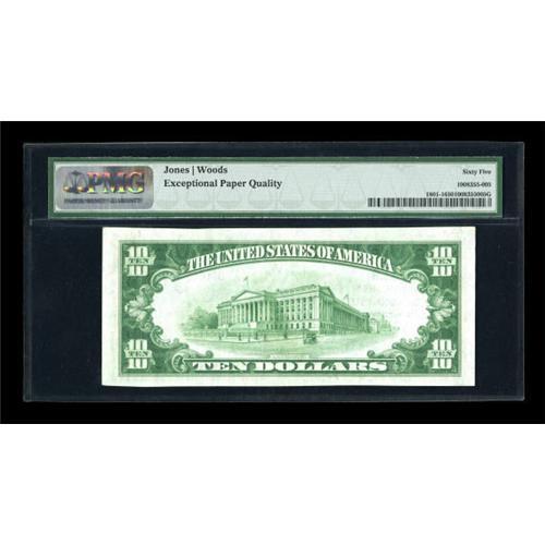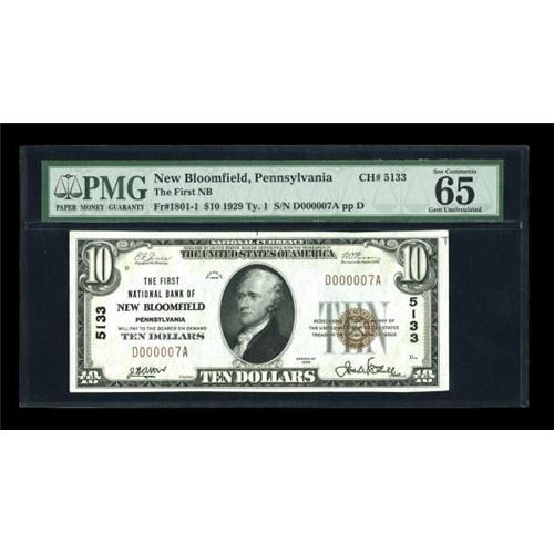 <B>New Bloomfield, PA</B></I> - $10 1929 Ty. 1 <B>The First NB</B></I> Ch. # 5133<BR> This pleasing serial number seven note is widely margined with plenty of embossing noticed. <B>PMG Gem Uncirculated 65 EPQ</B></I>.<BR><BR><b>Shipping:</b> Coins & Currency (<a target="_blank" href="http://www.heritageauctions.com/common/shipping.php">view shipping information</a>)