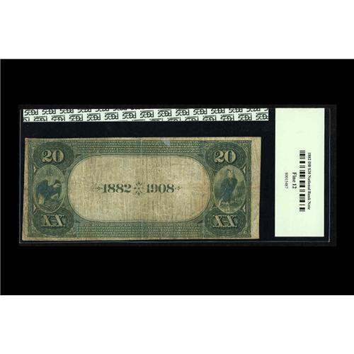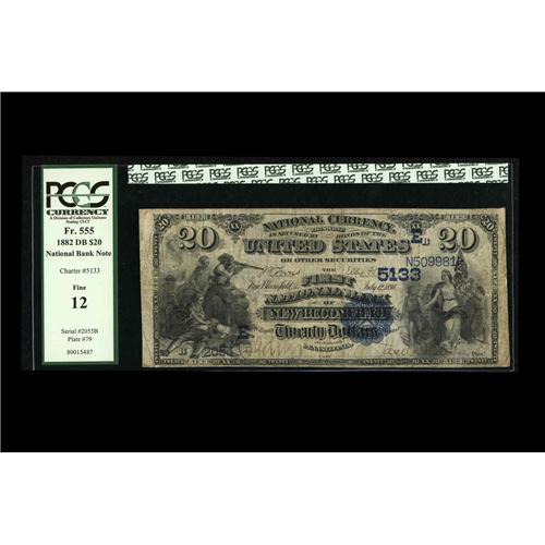 <B>New Bloomfield, PA</B></I> - $20 1882 Date Back Fr. 555 <B>The First NB </B></I> Ch. # (E)5133<BR>Here is a pen signed $20 DB which has been graded <B>Fine 12</B></I> by PCGS.