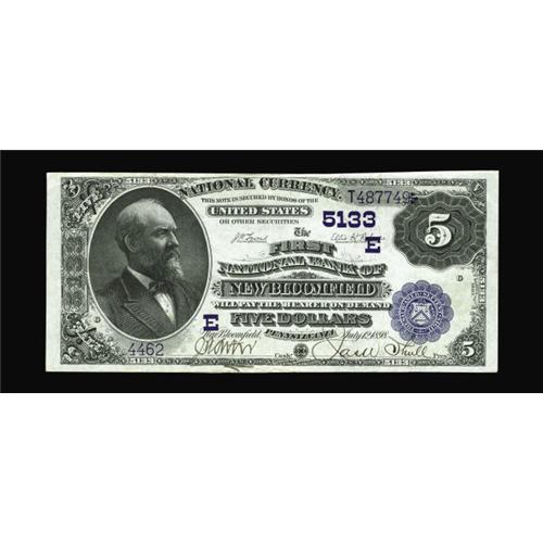 <B>New Bloomfield, PA</B></I> - $5 1882 Value Back Fr. 574 <B>The First NB</B></I> Ch. # (E)5133<BR>Original sheen and surfaces are merits of this beautiful $5. The black pen signatures are still bold after all of these years, too. A light spot is found near the top edge. <B>Extremely Fine.</B></I>