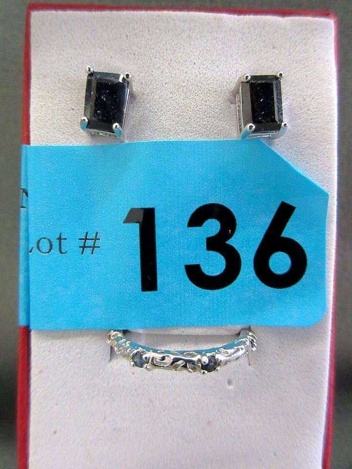 Sterling silver. Ring set with 7 round sapphires. Earrings are emerald cut. Post & butterfly backs. Retail value $300.