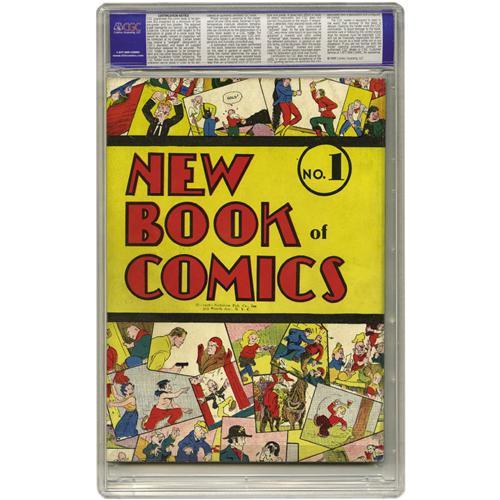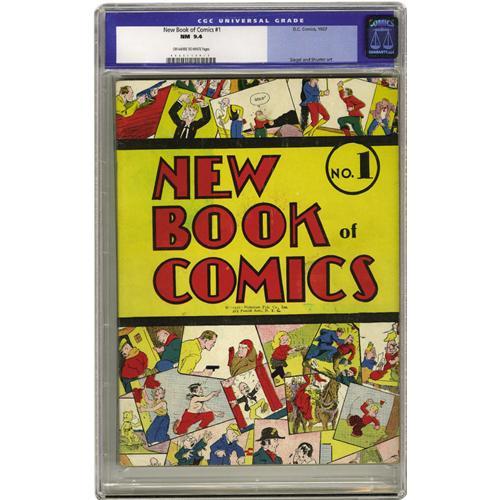 <B>New Book of Comics #1 (DC, 1937) CGC NM 9.4 Off-white to white pages.</B></I> The Overstreet Guide added a NM- price for this issue for the first time in the 2005 Guide, and that rocketed the book onto the Guide's list of the 50 most valuable Golden Age comics. Our offering is the proof that a top-grade copy does exist, yet ours remains the only one graded above 8.0 in CGC's census. Though we've got this one in our Golden Age section, it's technically a <I>Platinum Age</B></I> book, and the fact that the cover bears the copyright "Nicholson Pub. Co." shows how old the book is -- Malcolm Wheeler-Nicholson was the founder of DC, but didn't run the company for very long. Overstreet lists this as the first regular-size comic annual, and the second DC annual of any size. The issue has reprinted material from <B>New Comics</B></I> #1-4 and <B>More Fun Comics</B></I> #9. The issue's a coveted Gerber "8," and it's dubbed "rare" by Overstreet as well. Considering the age of this book and its rarity, this copy is an absolute wonder, <I>especially</B></I> since it's a square bound comic! The features inside date from 1935 and 1936 and include Dr. Occult and the Federal Men, both by future Superman creators Jerry Siegel and Joe Shuster. There's also artwork by Sheldon Moldoff, Sheldon Mayer, and many other notable names from the earliest days of comics. Overstreet 2006 NM- 9.2 value = $28,000. CGC census 03/06: 1 in 9.4, none higher.