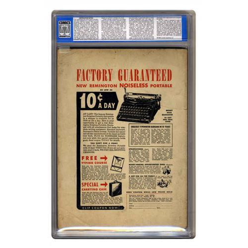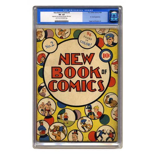 <B>New Book of Comics #2 (DC, 1938) CGC VG- 3.5 Light tan to off-white pages.</B></I> This early DC annual is a Gerber "8," and the first copy of the issue we've seen in quite a while. It's amazing how <I>heavy</B></I> the slab is -- back in '38, kids got a ton of content for the price of one thin dime! The insides reprint <B>More Fun Comics</B></I> #15 and 16, which among many other features included some Dr. Occult stories by Jerry Siegel and Joe Shuster in which the character wore a superhero costume, leading to the designation of these stories as a "Superman prototype." Siegel and Shuster also wrote and drew the "Calling All Cars" feature, which continued for many an issue of <B>More Fun</B></I> under the name Radio Squad. CGC notes, "Large piece out on 36th and 37th page, affects story." Overstreet 2005 VG 4.0 value = $2,000. CGC census 11/05: 1 in 3.5, 6 higher.