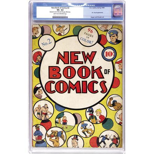 <B>New Book of Comics #2 (DC, 1938) CGC VG- 3.5 Light tan to off-white pages.</B></I> This very early DC square bound annual features stories from <B>More Fun</B></I> #15 and 16, starring Superman prototype Dr. Occult. Joe Shuster and Vincent Sullivan art. CGC notes, "Large piece out on 36th and 37th page, affects story." Overstreet 2006 VG 4.0 value = $2,042. CGC census 6/06: 1 in 3.5, 6 higher. <BR><BR><B>Important notice:</B> Heritage usually auctions material at the rate of 200-250 lots per hour. On some occasions eBay Live bid software or the Internet may not be able to keep up with the pace of the auction. We recommend placing a realistic absentee bid now as insurance to avoid disappointment. Occasionally the auctioneer may eliminate or reject an eBay Live bid, and the auctioneer may also reopen a lot after the close of the eBay live bidding (usually because we missed an audience bid), and may reject your bid even if it shows you as the winning bidder. By bidding via eBay Live, you agree that Heritage may award the lot to another bidder at its sole discretion under the circumstances described above or any other reasonable circumstances. Since eBay bids are not shown to us until we open the lot on the floor, we treat those bids just like floor bids. In most cases the floor responds before the eBay bid is presented to us, due to Internet lag time, so for consistency we have made it a policy that floor bids are always considered first over tie eBay live bids. Also please note that all Heritage lots purchased through eBay Live carry a 22.5% Buyer's Premium. Please make sure you read the Terms and Conditions before you bid. This lot is being auctioned in conjunction with a live floor auction by Heritage Auction Galleries. All final auction and invoice information will be supplied by Heritage Auction Galleries, and all other information should be considered preliminary. Lot:41001 <BR><BR><B>Winning Notification and Billing:</B> After the FINAL session in this auction is complete, Heritage will send e-mail and snail mail invoices. This process normally takes several days. All final auction and invoice information will be supplied by Heritage Auction Galleries, and all other information should be considered preliminary. <BR><BR>This auction will be conducted on a live auction floor and over the Internet through eBay Live. If you choose to place an absentee bid, please take a moment to <font color='#0000ff'><u><a href='http://pages.ebay.com/liveauctions/help/before/laabsentee.html'>learn how eBay Live absentee bidding works</a></u></font><font color='#000000'>