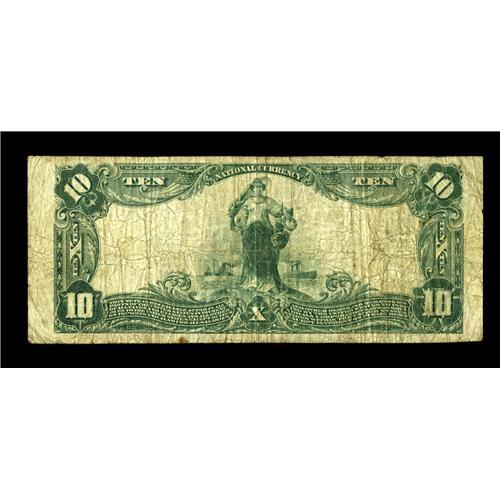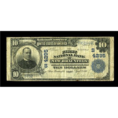 <B>New Braunfels, TX</B></I> - $10 1902 Plain Back Fr. 627 <B>The First NB</B></I> Ch. # (S)4295<BR>This was the only one of the two federally chartered banks located here to issue the $10 Plain Backs, of which just two examples, including this nice <B>Very Good+</B></I> are documented in the census. Joseph Faust signs as President, with the Cashier signature faded. We sold this note once before, at our 1999 Florida United Numismatists auction, where it was hammered down at $467.50. That result will likely seem a bargain from a nostalgic era when the final realization is determined tonight in a more robust market for scarce Nationals.<BR><BR><b>Shipping:</b> Coin/Currency (<a target="_blank" href="http://www.heritageauctions.com/common/shipping.php">view shipping information</a>)