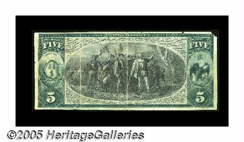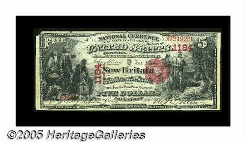 <B>New Britain, CT</B></I> - $5 1875 Fr. 403 <B>The New Britain NB</B></I> Ch. # 1184<BR>An extremely rare bank in large size, with the census standing at just eight such examples of all kinds. This is a bright and attractive-appearing note, but there are a few small tape repairs on the back and it is missing a corner as well, along with displaying a few margin nicks. It certainly has the look of a note grading <B>Very Fine</B></I> or better, and its rarity will likely carry it to...