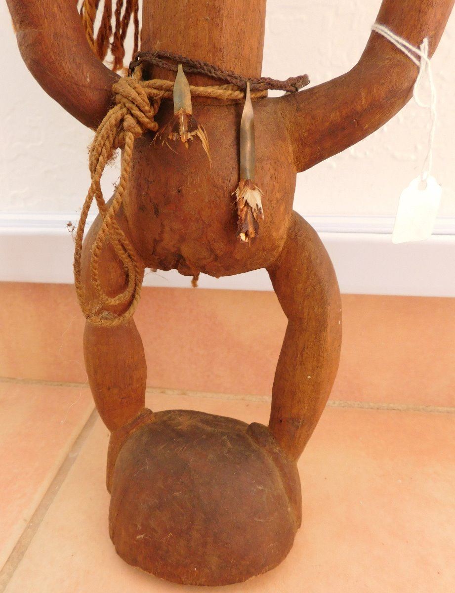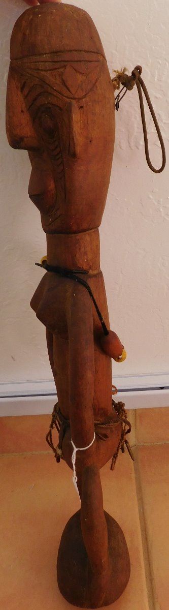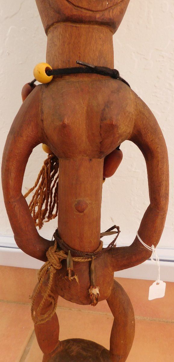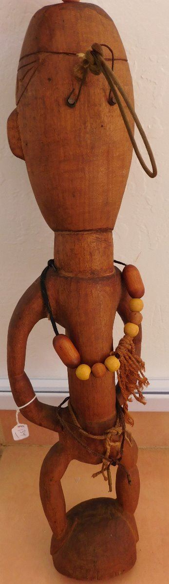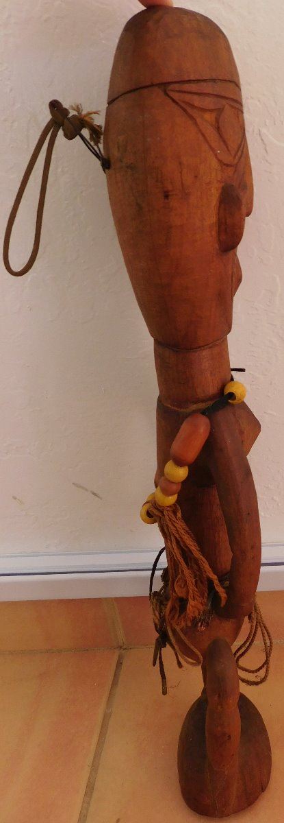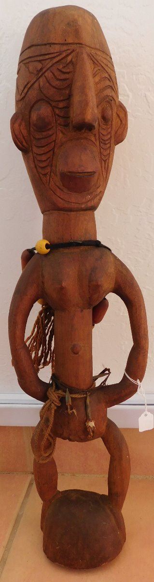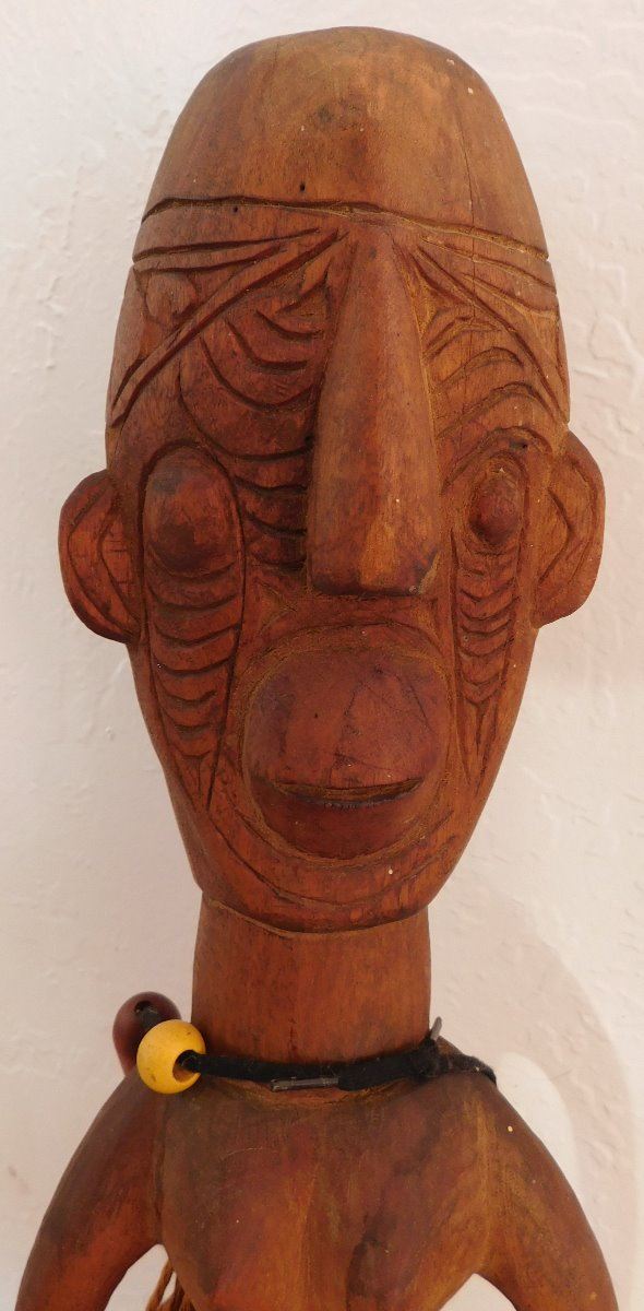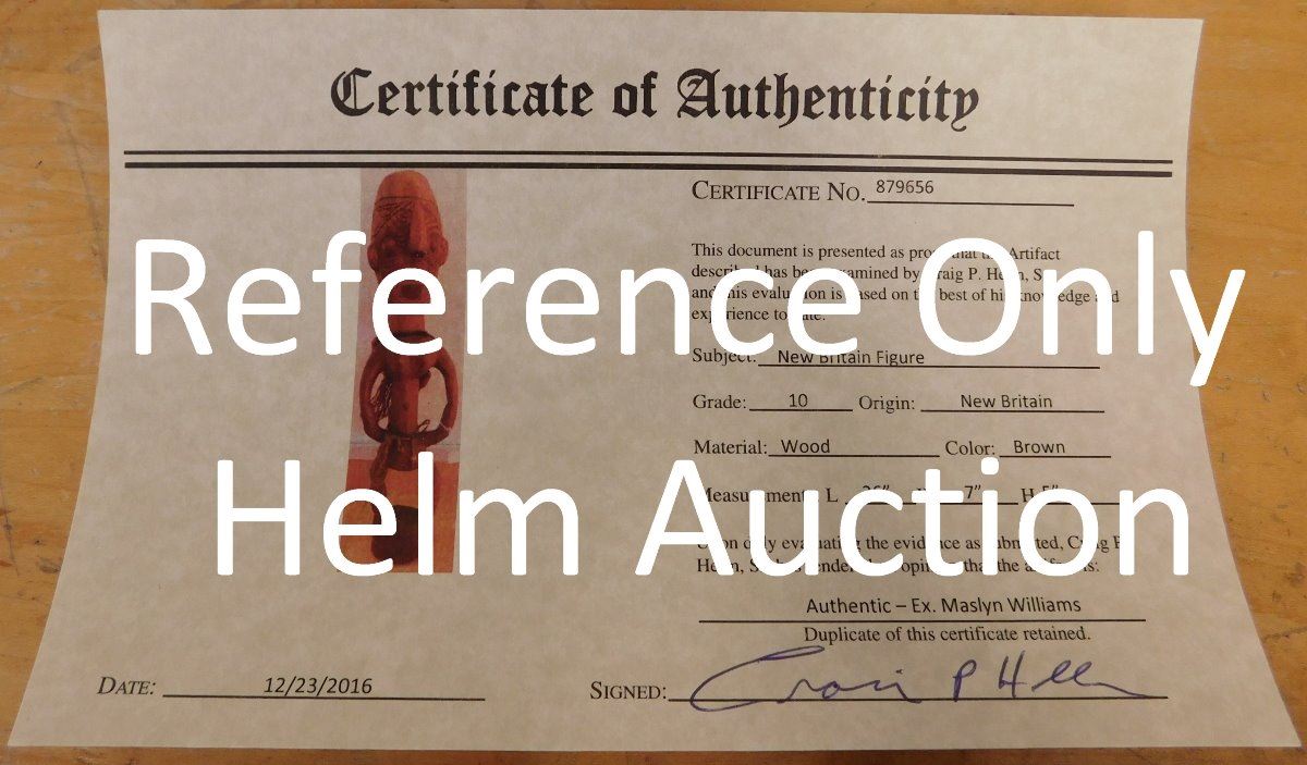 New Britain Figure, circa WWII. Made of wood with shell eyes, the item measures 26" x 7" x 5". New Britain, Polynesia. Nice tiki. Ex. Maslyn Williams, author of Stone Age Island. Helm Certificate of Authenticity. Condition: Good, see images. Shipping: $50.00, USA estimate only, due to size and weight, w/insurance and signature.