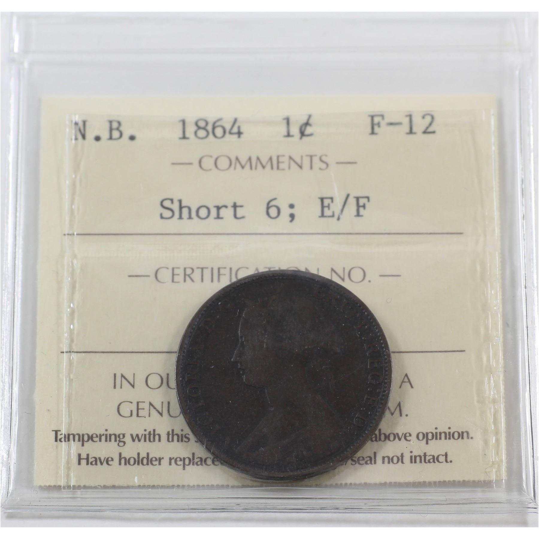New Brunswick 1-cent 1864 Short 6; E/F ICCS Certified F-12.