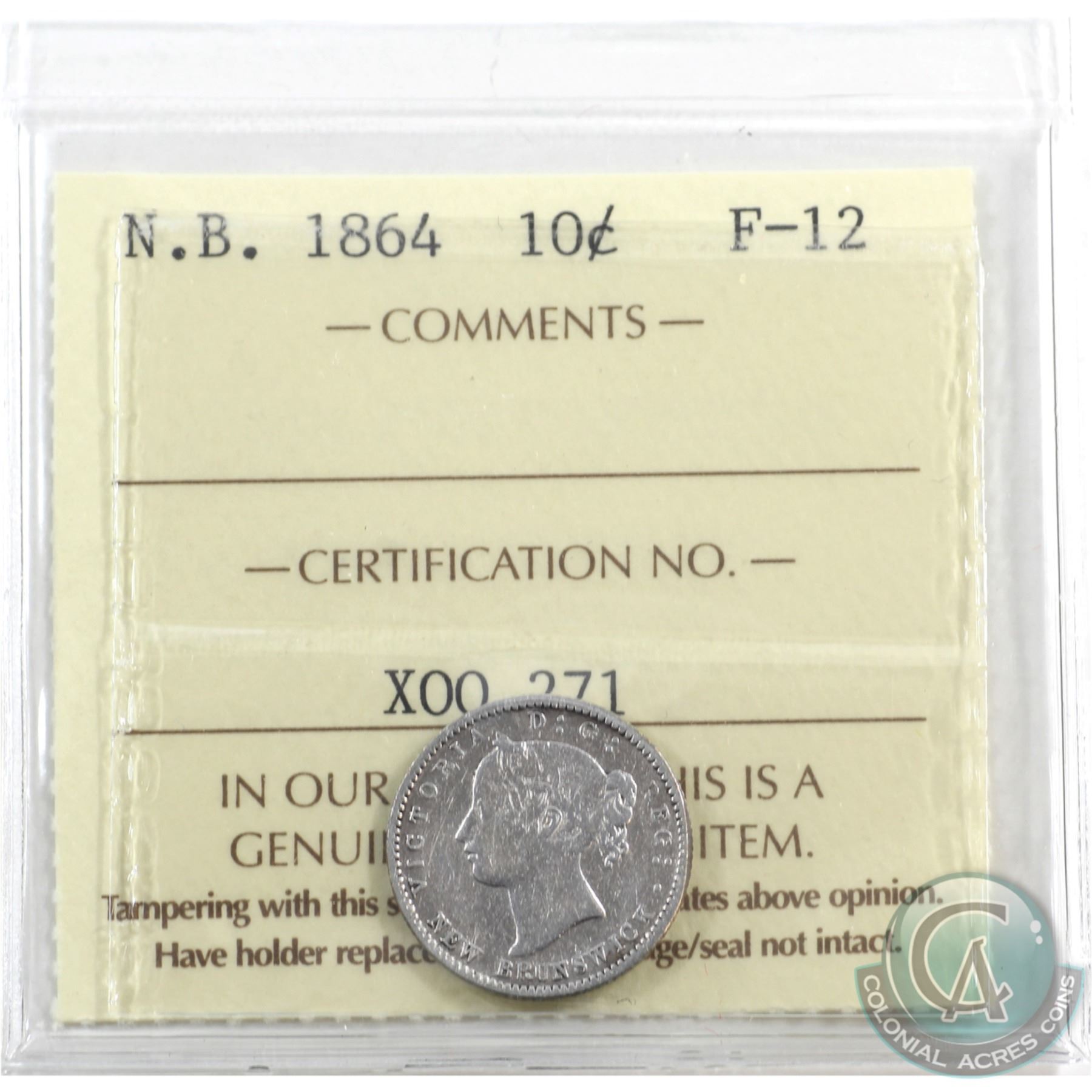 New Brunswick 10-cent 1864 ICCS Certified F-12