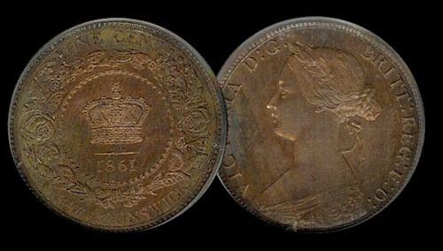 New Brunswick 1861 1¢ PCGS SP64 Red/Brown. The Belzberg example. 35% red with reflective surfaces.