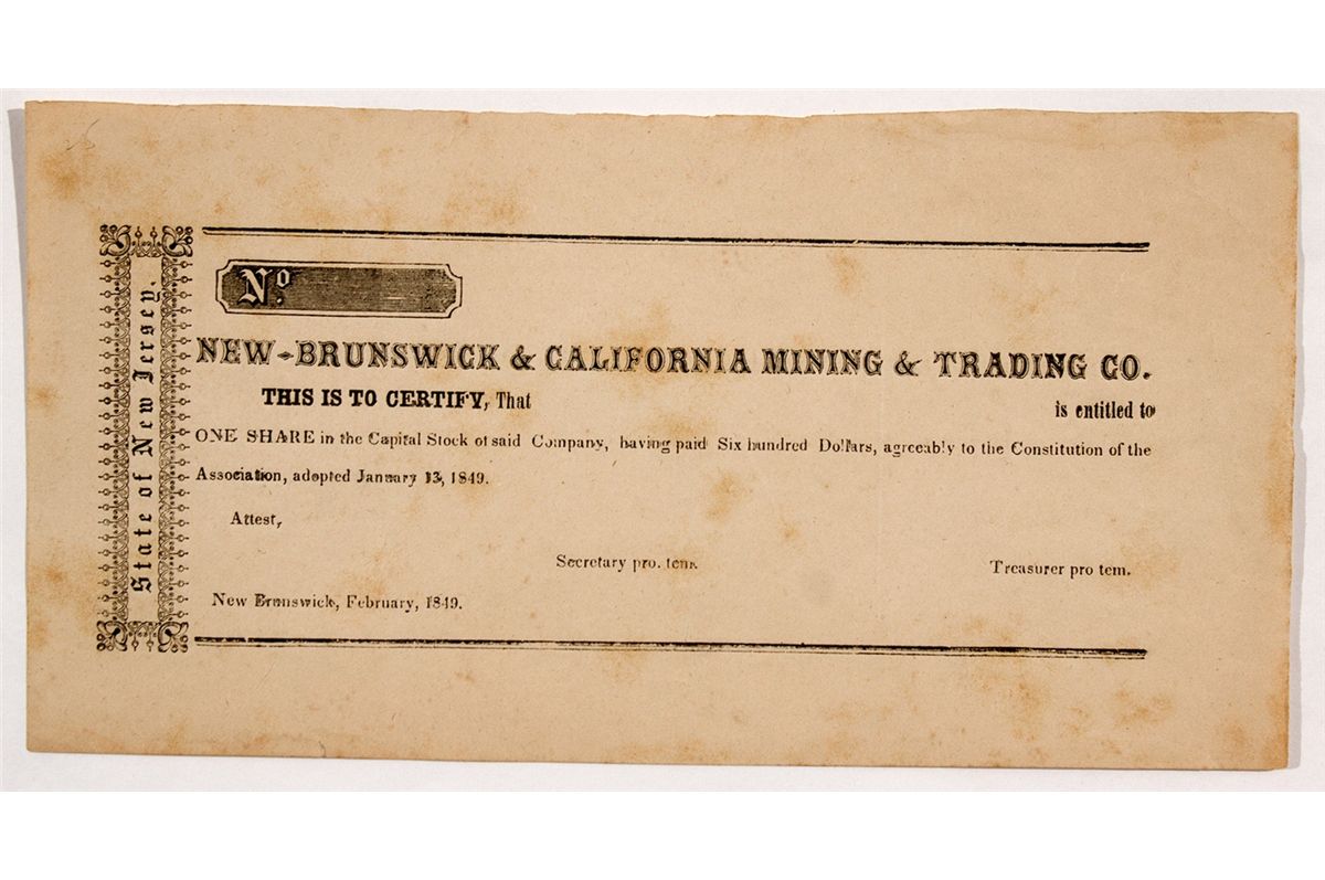 c1849 This is an important, perhaps earliest known, California Gold Rush stock certificate. A blank certificate for one share, unissued and unsigned. "Association, adopted January 13, 1849" is printed under the masthead. Very plain, 1/3-sheet size (4 x 7.75"), on crème paper with black print. State of New Jersey is printed at left border. Datelined New Brunswick, February, 1849. The Maritime Heritage organization describes this company thusly: "Once news of California's Gold Rush reached the East Coast, groups of men began forming mining companies to help defray the great expenses of reaching the gold fields, and with the hope of having more success by banding together. More than 500 vessels left Atlantic and Gulf ports during 1849. After the best ships were full, virtually anything afloat, including old traders, whalers and small schooners were booked. Groups chartered or purchased a ship, many of which were extremely small, and sailed from their homes to the fields of gold…a partial list of mining companies leaving the Eastern Seaboard for California in 1848 and 1850.…. Isabel (New Brunswick and California Mining and Trading Company), 237-ton bark, built 1844 in Baltimore, Maryland. Left New York, New York on February 7, 1849, arrived San Francisco August 5, 1849. 179 days at sea. Captain N.R. Brewer 48 passengers. Non-stop via Cape Horn. Sold abroad and used in South American trade after arrival. Passenger James V. Spader wrote two long letters (February 7-August 18, 1849) during the voyage, which are held at the Rutgers University Library, New Brunswick, New Jersey. Much of the second letter duplicates information in the first one. Entries are very brief, limited primarily to weather conditions, speed, latitude and longitude, temperature, sails set and taken in, etc" [Ref: www.maritimeheritage.org/PassLists/mining.htm]. - HKA#65982