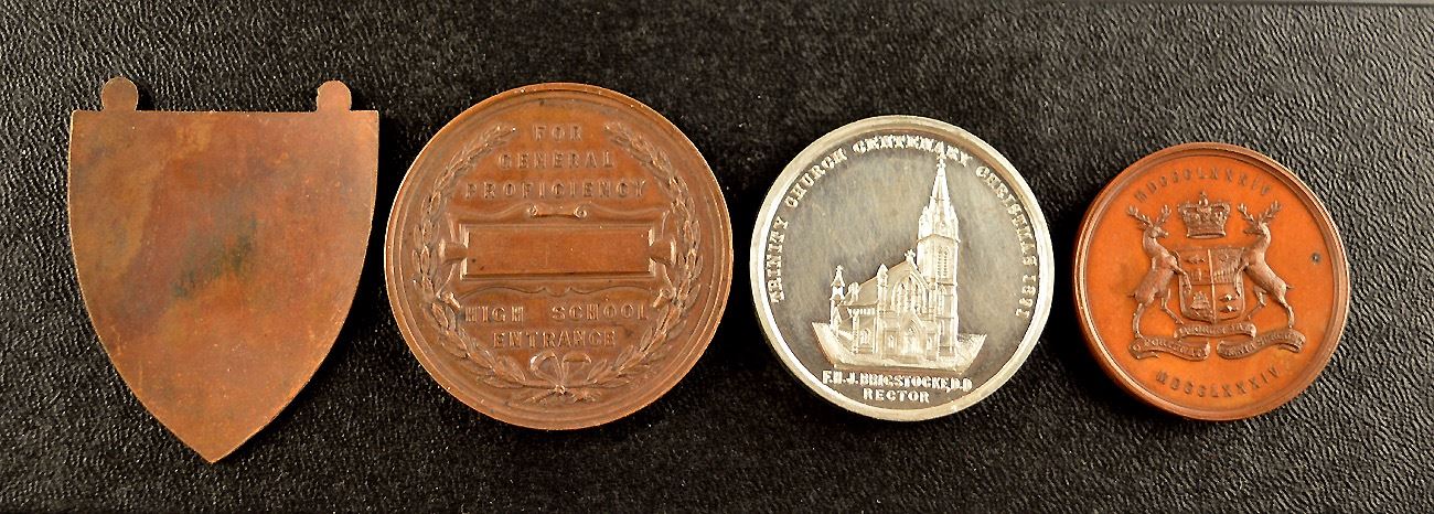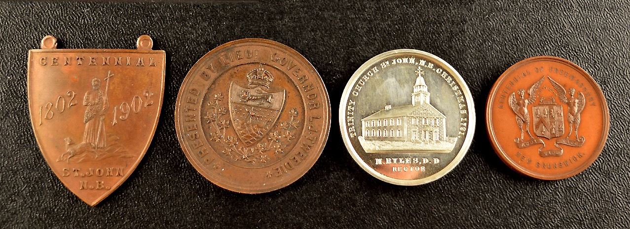 (1)- Trinity Church, St. John, NB, Christmas, 1891, Lr.1235v, Wm, EF, edge bump; (2)- Centennial of Freemasonry, New Brunswick, 1884, Lr.1575, Ae, FDC; (3)- Centennial St. John, N.B., 1802-1902, in shape of a triangular plaque, Ae, 37.65 x 47.8, VF; (4)- Lieutenant Governor General Medal, New Brunswick, L.J. Tweedie, For General Proficiency. Ae, 43mm, VF, unawarded. He was Lieutenant Governor of NB for 5 years, 1907-1912; Total 4 medals.