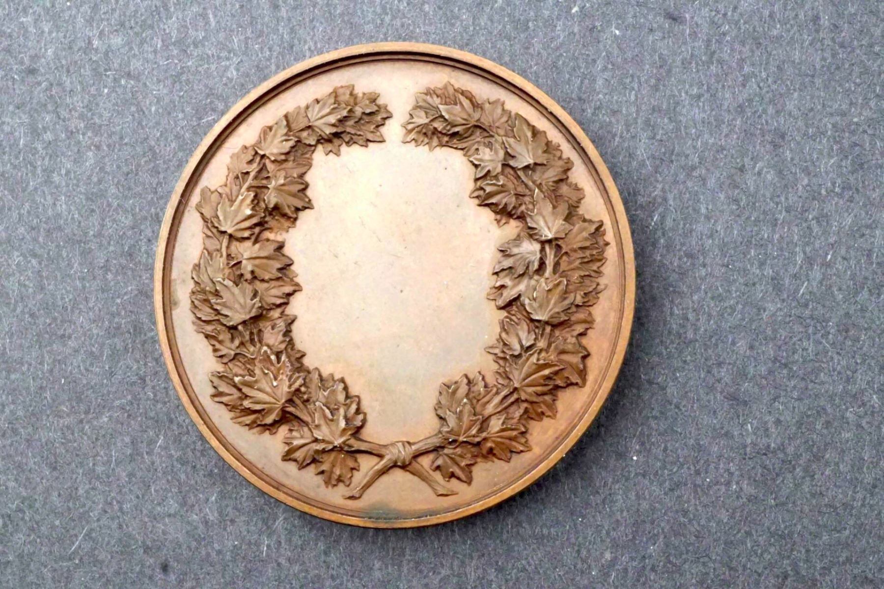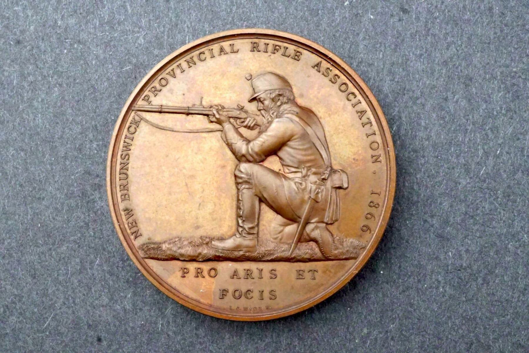 47 mm, 63 grams. NEW BRUNSWICK RIFLE ASSOCIATION 1866 Rifleman in militia drees, on one knee, aiming his rifle. In exergue: PRO ARIS ET / FOCIS. Signed: L. C. Wyon F. Below. Reverse is a high relief wreath, with space for engraving at center. Condition is glossy brown UNC.