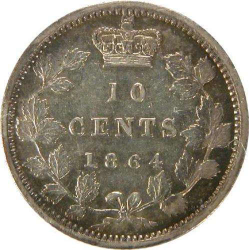 Ten Cents 1864 ICCS EF-40. A very sharp piece with considerable remaining lustre and a pale golden toning with light blues at the rims