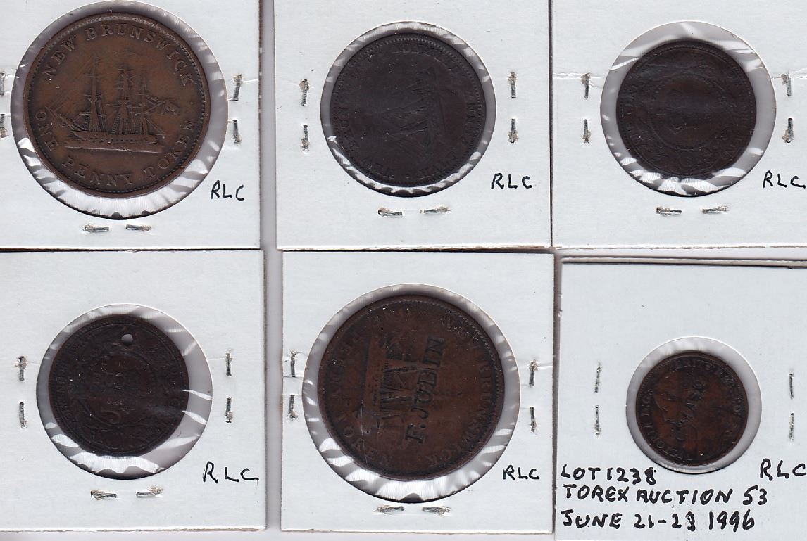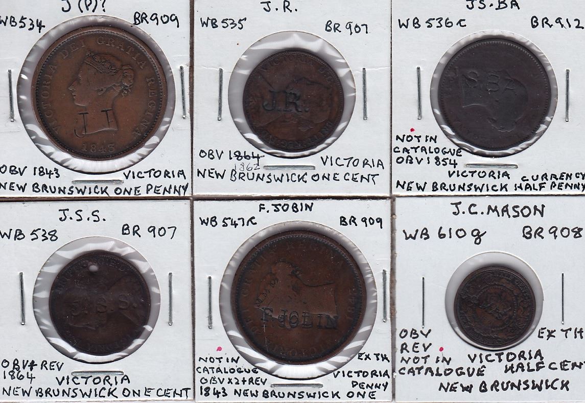 J (P?) on obv. of New Brunswick penny, 1843, Br 909; J.R. on obv. of New Brunswick cent, 1864, Br 907 (M.I. 535); J.S.B.A. on obv. of New Brunswick ½ penny, 1854, Br 912; J.S.S. on obv. & rev. of New Brunswick cent, 1864, Br 907 (M.I. 538); F. JOBIN on obv. & rev. of New Brunswick penny, 1843, Br 909 (Brunk J-121); J.C. MASON on obv. & rev. of New Brunswick ½ cent, 1861, Br 908 (Brunk M-270). 6 Pcs.
