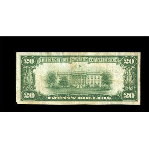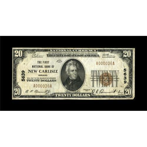 <B>New Carlisle, IN</B></I> - $20 1929 Ty. 1 <B>The First NB</B></I> Ch. # 5639<BR> Seven small size examples are reported for this Saint Joseph County issuer. Some crispness remains on this <B>Fine+</B></I> note<B>.</B></I><BR><I>From The Kansas City Collection.</B></I><BR><BR><b>Shipping:</b> Coins & Currency (<a target="_blank" href="http://www.heritageauctions.com/common/shipping.php">view shipping information</a>)