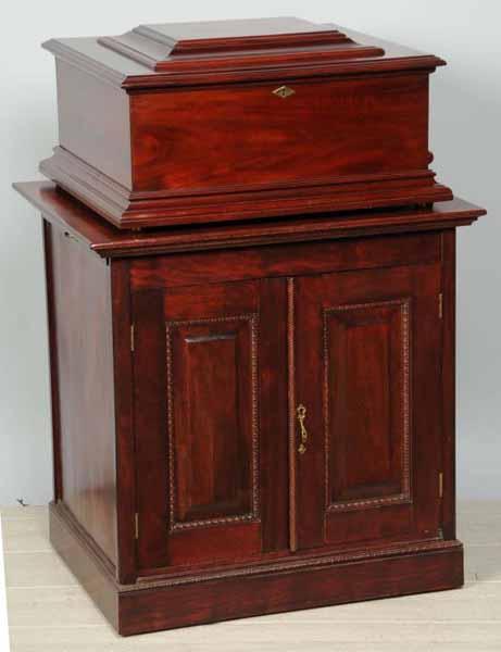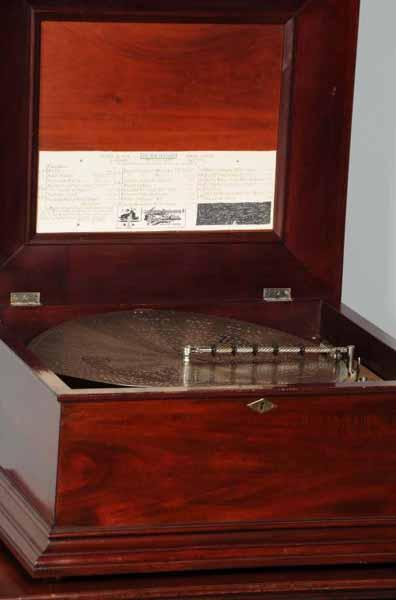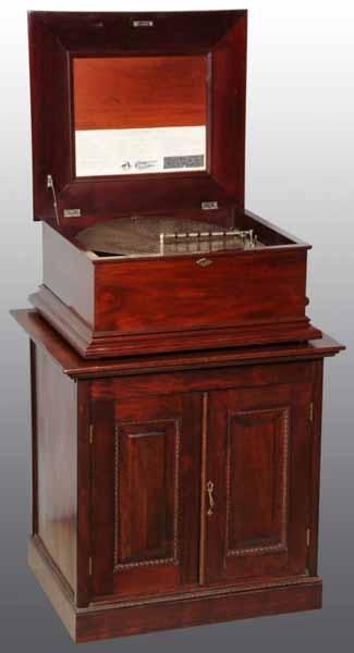 Description Nice mahogany case with 22 discs. Working. Condition (Good). Size 18 - 1/2".