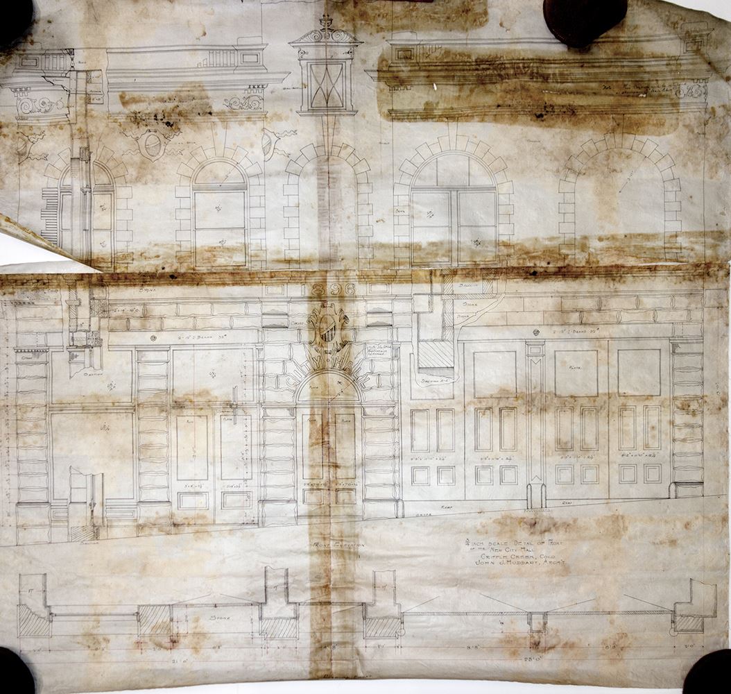 3/4 Inch Scale Detail of Front/ of the New City Hall/ Cripple Creek, Colo./ John J. Huddart, ARCH'T. One of the leading Denver architects at the turn of the century was British-born and trained John J. Huddart. His many landmarks include the Charles Boettcher House in Denver, Colorado's Fort Morgan State Armory, the Gold Mining Stock Exchange in Cripple Creek, Denver's Filbeck Building, and Cripple Creek's Hotel St. Nicholas. Huddart was very involved with public buildings and was well known as a courthouse architect, producing at least eight in Colorado. His courthouse design phase lasted about seven years, beginning in 1905. He produced plans for six Colorado courthouses, including the Adams County Courthouse in Brighton (1905), Cheyenne County (1908), Washington County (1908-10); Logan County (1908-10), Summit County (1909), Saguache County (1910), and Elbert County (1912). Two final courthouse projects came to Huddart late in his career - Lincoln County (1923) and Custer County (1929) (historycolorado.org). Following two fires within a week in 1896 which devastated Cripple Creek, the city was later rebuilt in brick. The reconstruction period after the fires of 1896 helped change Cripple creek into a first class city, which officially achieved "city" status in 1897. It took two years to complete the City Hall, after which the building housed the central fire department, the board of aldermen, and the clerk's and treasurer's offices. These plans utilize brick and stone building materials, with the number 1896 prominently displayed over the main entrance, which is centered in the structure. Photographs of the historic Cripple Creek City Hall frontage present a different design, a brick building with the number 1898 displayed over left side of the building, above the city hall sign. The right side of the building includes a Central Fire Station sign not included in our print. This may represent one of Huddart's early designs which was later changed to include the fire station, or a new architect'as design might have been used, further research is needed. Measures 37" x 35 1/2", in poor condition, with several tears repaired by document tape, glue residue, and foxing present..