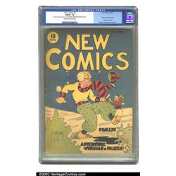 New Comics #1 (DC, 1935) CGC FN/VF 7.0 Cream to off-white pages. After the success of its inaugural title New Fun, DC decided to try their hand at another one nine months later, calling it New Comics. They felt this sounded a little too similar, and so New Fun became More Fun. New Comics would last as such until issue #11, when it also made a title change, adding the word "Adventure." Printed at the dawn of modern comics, all of these issues are quite rare, making this particular copy nothing short of remarkable. Due to flat paper stock used to print the cover, no gloss is ever present, and all copies have a dull appearance. But from a structural standpoint, little is wrong with this copy; tiny tears at the top staples, a small hole and stain on the back cover, and a tiny chip out of the top edge of the front cover are all that's visibly wrong. CGC notes a very minor amount of glue on the cover. Overstreet 2002 FN 6.0 value = $8,550; VF 8.0 value = $18,500. Important notice: We expect to be auctioning lots at the rate of 200-250 per hour. Sometimes eBay Premier live bid software cannot keep up with that pace, so we strongly recommend that you place a realistic proxy bid now as insurance to avoid disappointment. Also please note that all Heritage/CAA lots purchased through eBay Premier carry a 20% Buyer's Premium. Please make sure you read the Terms and Conditions.
