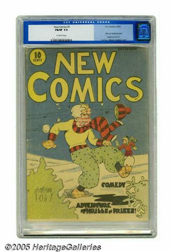 <B>New Comics #1 (DC, 1935) CGC FN/VF 7.0 Off-white pages.</B></I> Here's a piece of DC history -- the first issue of only the second series DC ever published, appearing more than a year earlier than <B>Detective Comics</B></I> #1! This title ran 11 issues before turning into <B>New Adventure Comics</B></I>. Thereafter it became <B>Adventure Comics</B></I>, and this series that began in the Platinum Age made it all the way to the Modern Age, with a lifespan of 48 years and 503 issues. This key first issue is ranked among the 100 most valuable comic books by Overstreet. You may be surprised to learn that the book has Walt Kelly art, DC not being a publisher he's usually associated with. There's also art by Sheldon Mayer and Whitney Ellsworth. The cover is by Vin Sullivan. Overstreet doesn't list values for grades above VF for the book, and according to CGC's census, only one copy of the issue has been graded higher than our offering. Overstreet 2005 FN 6.0 value = $8,700; VF 8.0 value = $20,000. CGC census 1/05: 2 in 7.0, 1 higher. <I>From the Northern Lights Collection.</B></I>