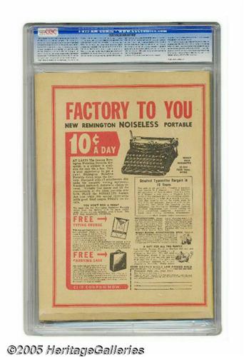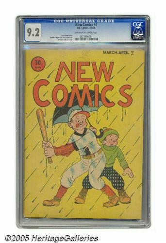 <B>New Comics #4 (DC, 1936) CGC NM- 9.2 Off-white to white pages.</B></I> We were wowed by the sight of a Platinum Age book in CGC 9.2 condition! It certainly beats the pants off of the second highest-graded copy in CGC's census, which checks in at 5.5. Overstreet was so pessimistic about the possibility of a high-grade copy that the Guide doesn't list a value above VF. As for the book itself (a Gerber "7" by the way), it offered 84 pages of entertainment for a dime, with a mix of adventure yarns and gag features. The cover is by Vincent Sullivan; highlights include a Federal Men story by Jerry Siegel and Joe Shuster (who would go on to create Superman), several features drawn by Sheldon Mayer, and a partial adaptation of Charles Dickens' <B>A Tale of Two Cities</B></I>. Overstreet 2005 VF 8.0 value = $5,000 (highest value listed by Overstreet). CGC census 1/05: 1 in 9.2, none higher. <I>From the Northern Lights Collection.</B></I>