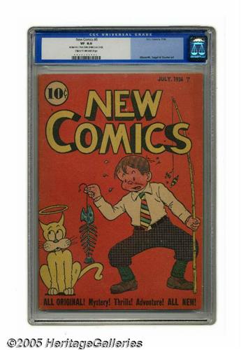 <B>New Comics #6 (DC, 1936) CGC VF 8.0 Cream to off-white pages.</B></I> This Gerber "rare" issue is a real find in this condition. Overstreet doesn't even list a higher grade value than 8.0. Whitney Ellsworth's cover art was a staple of the Platinum Age DCs, and the co-creators of Superman, Jerry Siegel and Joe Shuster, cut their teeth here well before <B>Action Comics</B></I> #1. CGC notes, "From the Collection of Nicolas Cage." Overstreet 2005 VF 8.0 value = $5,000. CGC census 1/05: 2 in 8.0, none higher. <I>From the Northern Lights Collection</B></I>.