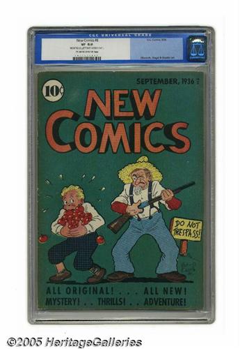 <B>New Comics #8 (DC, 1936) CGC VF 8.0 Cream to off-white pages.</B></I> CGC has certified just one copy of this Gerber "scarce" issue to date with a grade above 5.5, and here it is! Whitney Ellsworth cover, with a Jerry Siegel story and Joe Shuster art. CGC notes, "From the Collection of Nicolas Cage." Overstreet 2005 VF 8.0 value = $3,400. CGC census 1/05: 1 in 8.0, none higher. <I>From the Northern Lights Collection</B></I>.