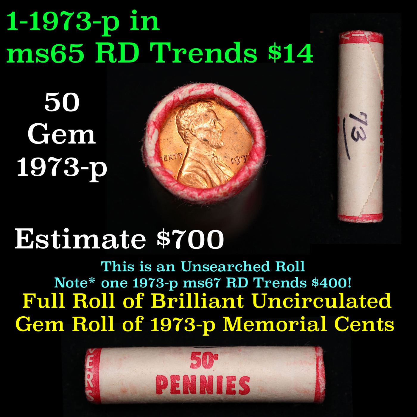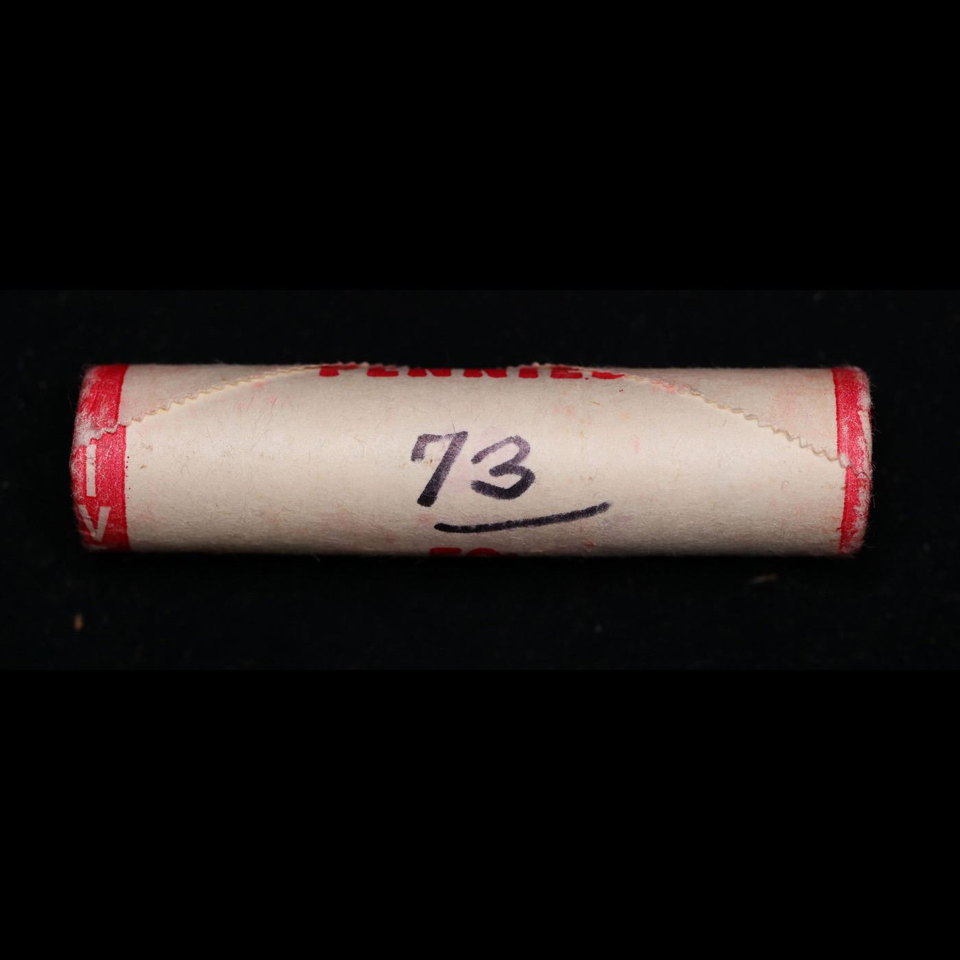 New Consignee This Auction Only!!! Shotgun Lincoln 1c roll, 1973-p 50 pcs Pennies Wrapper.. For This Auction Only We Have A New Private Collection Of Lincoln Cent Roll, All Of the Lincoln Cent Rolls In This auction are from 1 Private Estate. Some Are Marked WIth the date Some Are not We Are Selling Them As Is. All Have Tight ends and are in intresting Wrappers!!!. Limited Quantity THIS AUCTION ONLY!!!!. A terrific Shotgun roll of Lincoln cents. Most if not all coin should be cherry red.