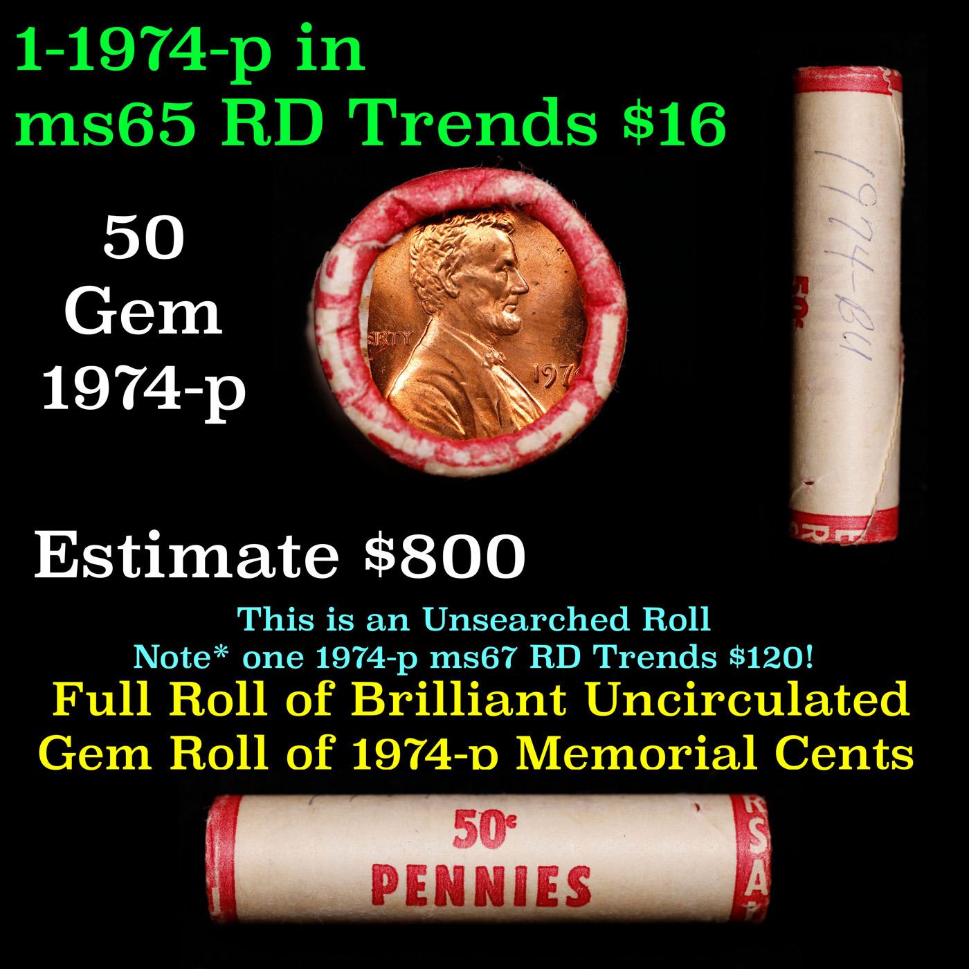New Consignee This Auction Only!!! Shotgun Lincoln 1c roll, 1974-p 50 pcs Pennies Wrapper.. For This Auction Only We Have A New Private Collection Of Lincoln Cent Roll, All Of the Lincoln Cent Rolls In This auction are from 1 Private Estate. Some Are Marked WIth the date Some Are not We Are Selling Them As Is. All Have Tight ends and are in intresting Wrappers!!!. Limited Quantity THIS AUCTION ONLY!!!!. A terrific Shotgun roll of Lincoln cents. Most if not all coin should be cherry red.