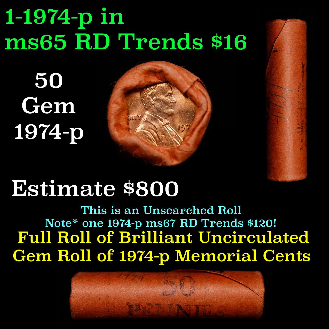 New Consignee This Auction Only!!! Shotgun Lincoln 1c roll, 1974-p 50 pcs Standard-Johnson Wrapper.. For This Auction Only We Have A New Private Collection Of Lincoln Cent Roll, All Of the Lincoln Cent Rolls In This auction are from 1 Private Estate. Some Are Marked WIth the date Some Are not We Are Selling Them As Is. All Have Tight ends and are in intresting Wrappers!!!. Limited Quantity THIS AUCTION ONLY!!!!. A terrific Shotgun roll of Lincoln cents. Most if not all coin should be cherry red.
