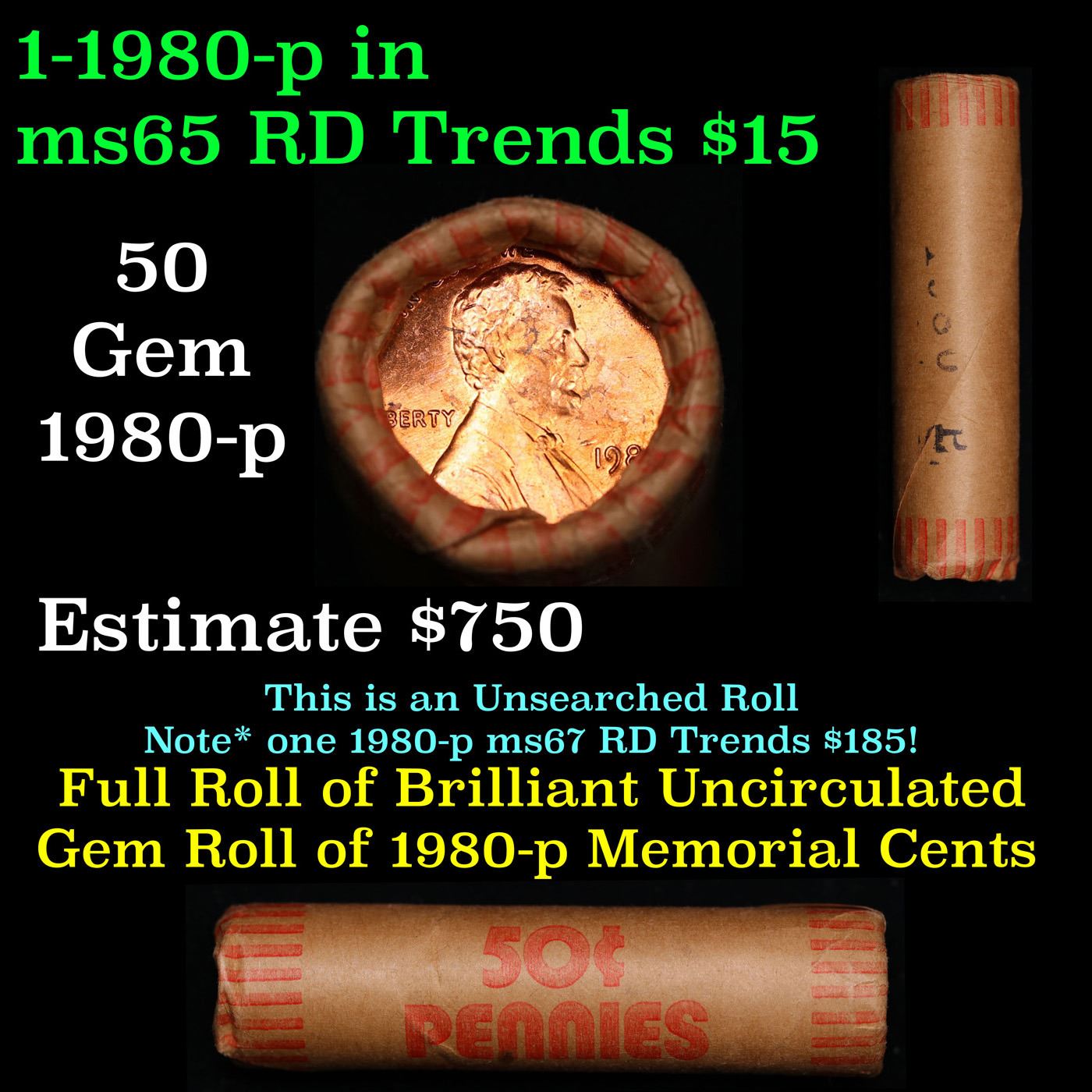 New Consignee This Auction Only!!! Shotgun Lincoln 1c roll, 1980-p 50 pcs Brandt Wrapper.