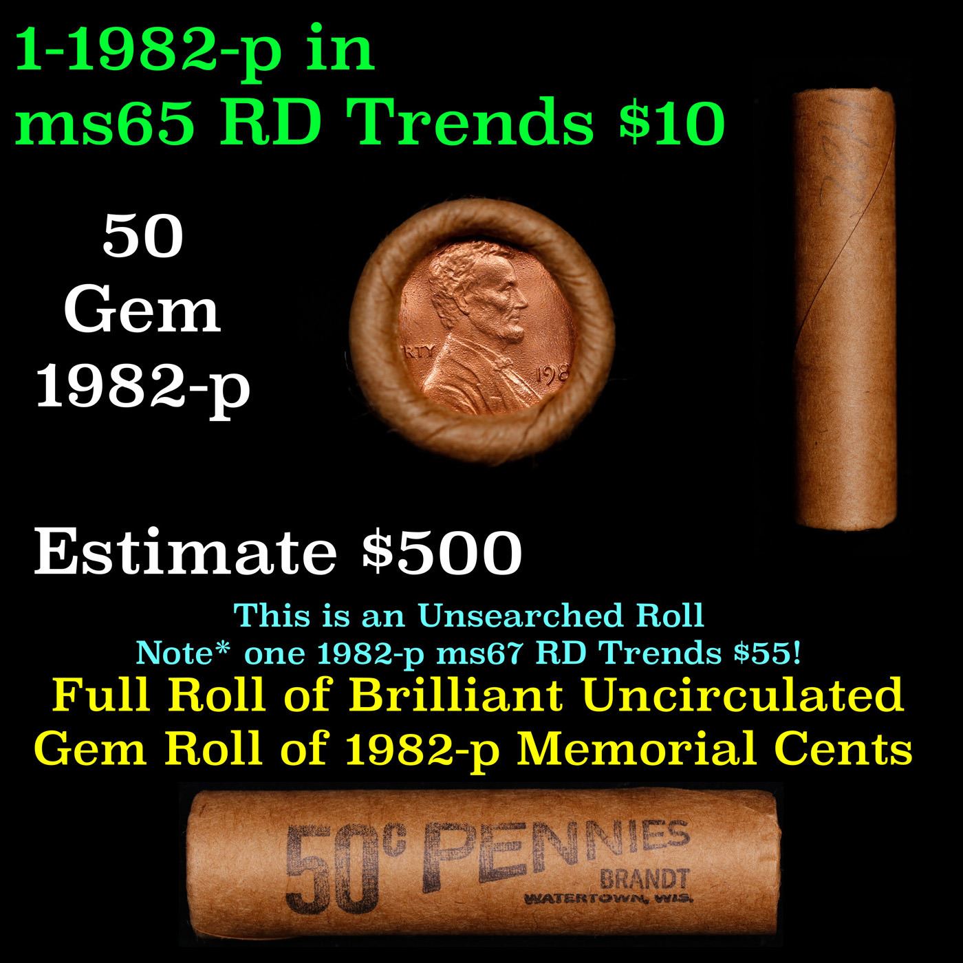New Consignee This Auction Only!!! Shotgun Lincoln 1c roll, 1982-p 50 pcs Brandt Wrapper.. For This Auction Only We Have A New Private Collection Of Lincoln Cent Roll, All Of the Lincoln Cent Rolls In This auction are from 1 Private Estate. Some Are Marked WIth the date Some Are not We Are Selling Them As Is. All Have Tight ends and are in intresting Wrappers!!!. Limited Quantity THIS AUCTION ONLY!!!!. A terrific Shotgun roll of Lincoln cents. Most if not all coin should be cherry red.