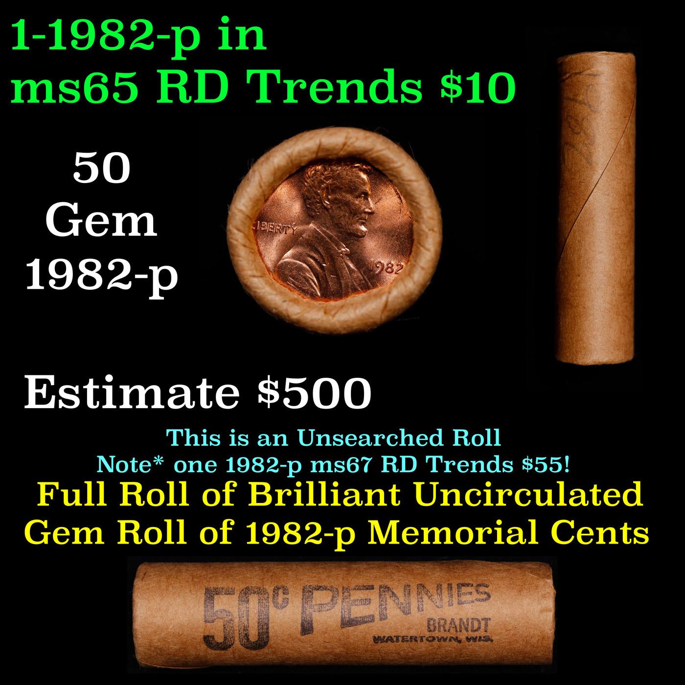 New Consignee This Auction Only!!! Shotgun Lincoln 1c roll, 1982-p 50 pcs Brandt Wrapper.. For This Auction Only We Have A New Private Collection Of Lincoln Cent Roll, All Of the Lincoln Cent Rolls In This auction are from 1 Private Estate. Some Are Marked WIth the date Some Are not We Are Selling Them As Is. All Have Tight ends and are in intresting Wrappers!!!. Limited Quantity THIS AUCTION ONLY!!!!. A terrific Shotgun roll of Lincoln cents. Most if not all coin should be cherry red.