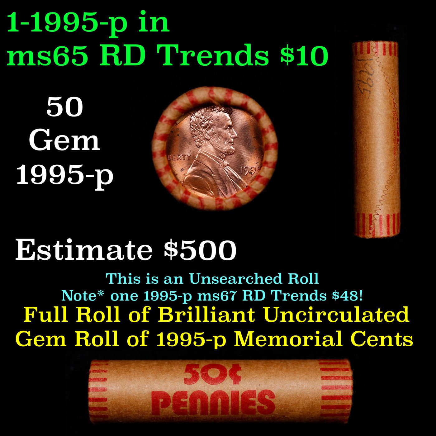 New Consignee This Auction Only!!! Shotgun Lincoln 1c roll, 1995-p 50 pcs Brandt Wrapper.