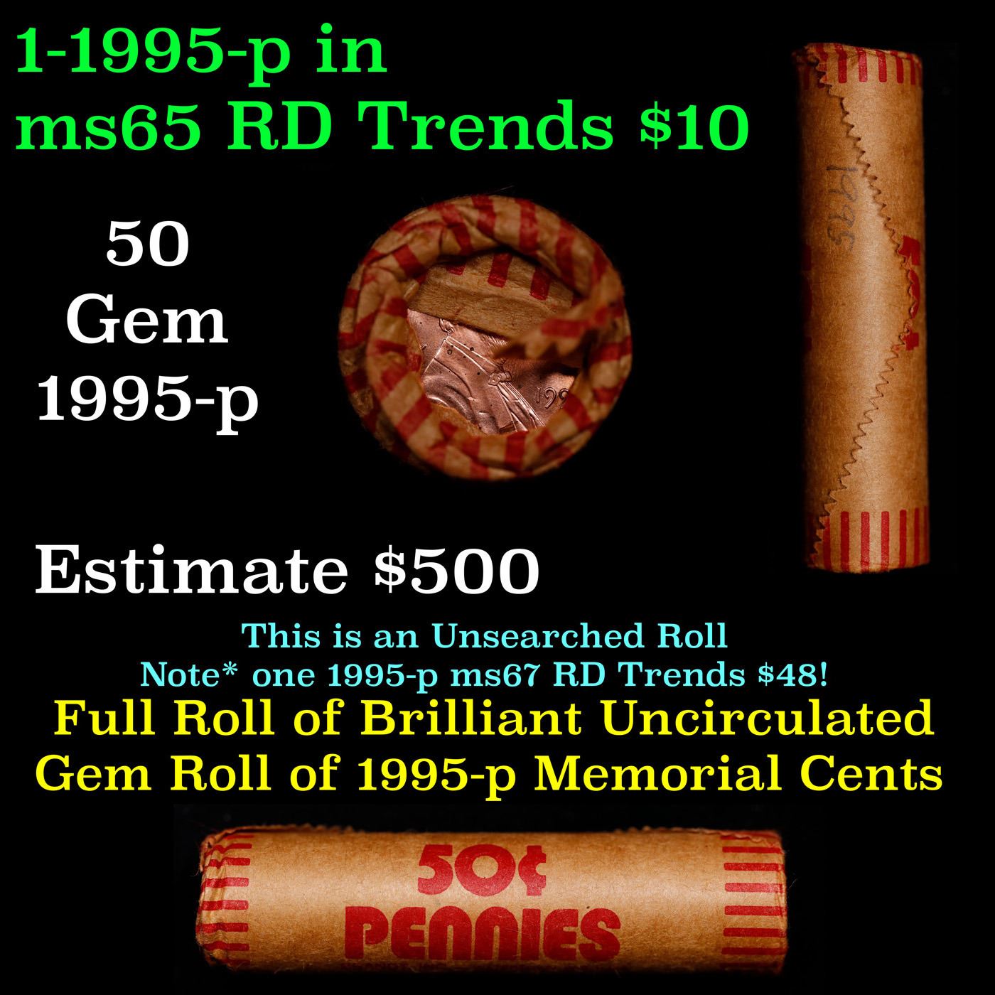 New Consignee This Auction Only!!! Shotgun Lincoln 1c roll, 1995-p 50 pcs Brandt Wrapper.. For This Auction Only We Have A New Private Collection Of Lincoln Cent Roll, All Of the Lincoln Cent Rolls In This auction are from 1 Private Estate. Some Are Marked WIth the date Some Are not We Are Selling Them As Is. All Have Tight ends and are in intresting Wrappers!!!. Limited Quantity THIS AUCTION ONLY!!!!. A terrific Shotgun roll of Lincoln cents. Most if not all coin should be cherry red.