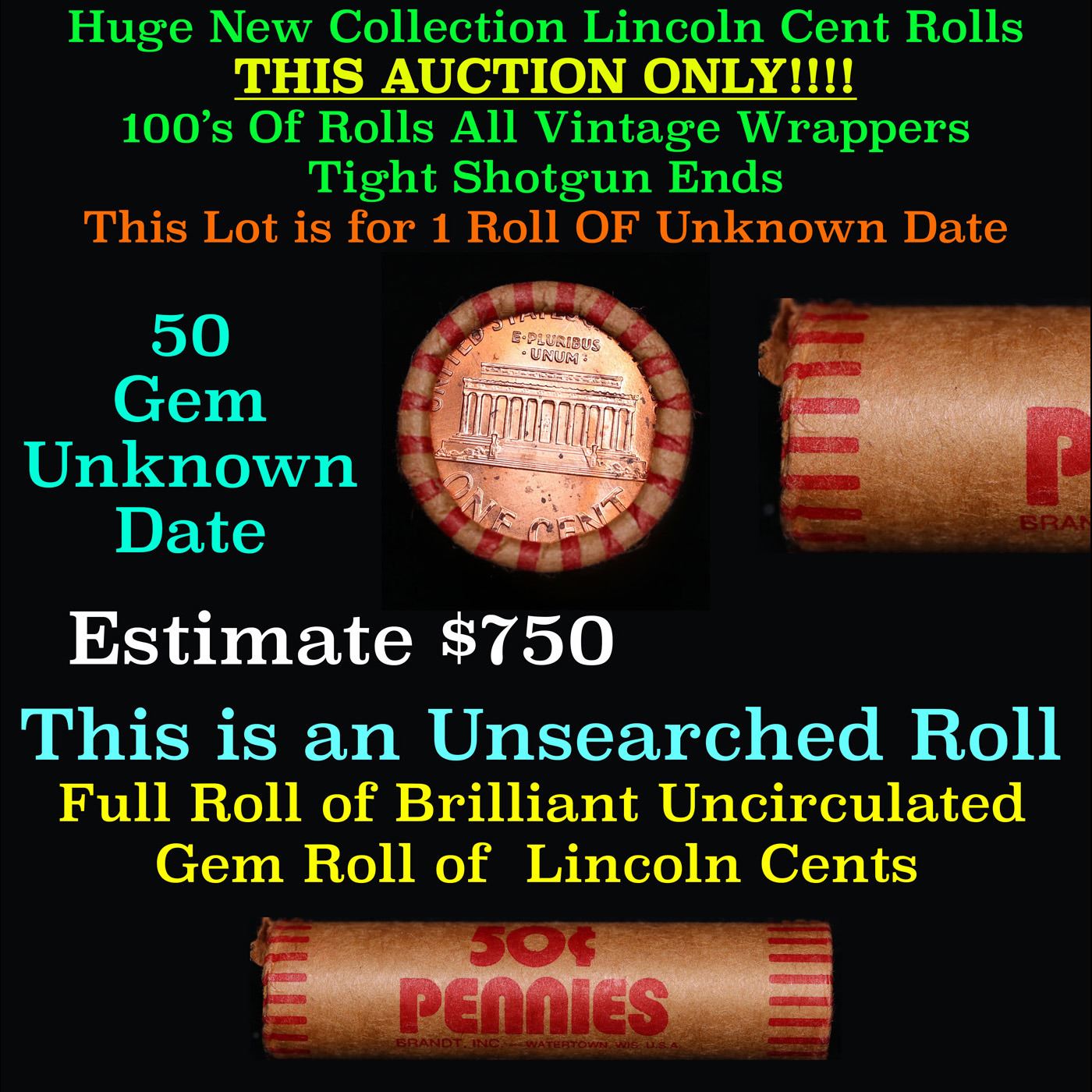 New Consignee This Auction Only!!! Shotgun Lincoln 1c roll, Unknown 50 pcs Brandt Wrapper.