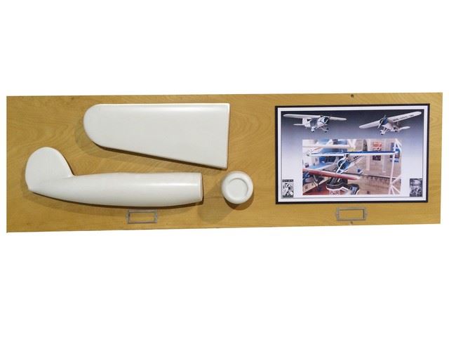 This original New Deal Studios wall display was created to showcase the process in which CNC Cutting would be employed on a miniature effects project. The project featured is Night at the Museum: The Battle of the Smithsonian's Smithsonian Air and Space miniature, of Wiley Post's Lockheed Aircraft, "Winnie Mae", that he flew solo around the world. The images and materials featured in this board start with a print of a CG rendering, a CNC cut urethane foam fuselage, wing and cowling section, the same foam shapes but covered in vacuum formed styrene and finally a photographic print of the finished miniature used in the film. All details mounted to lacquered birch. 97" long x 15" tall.