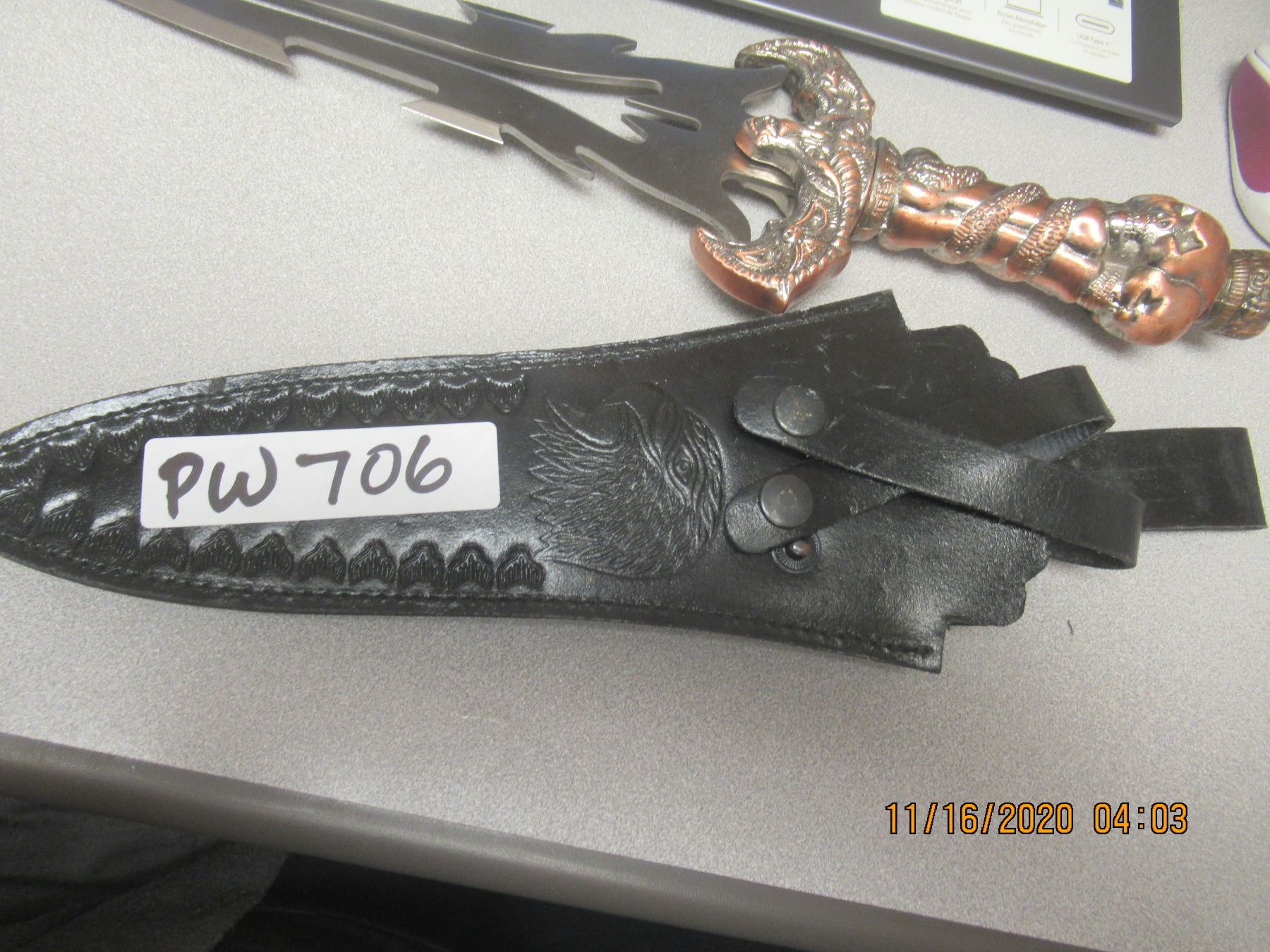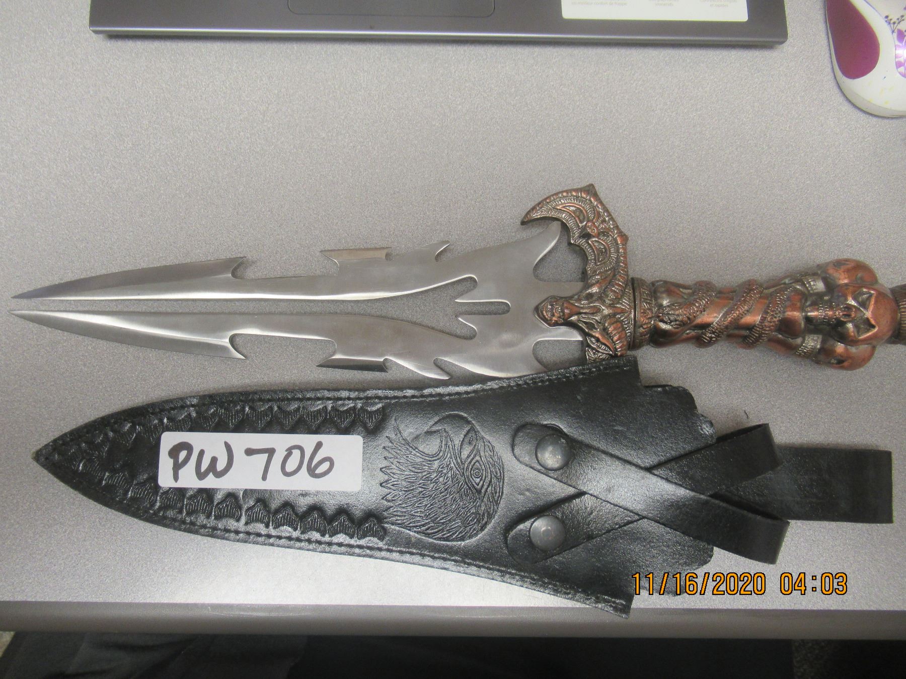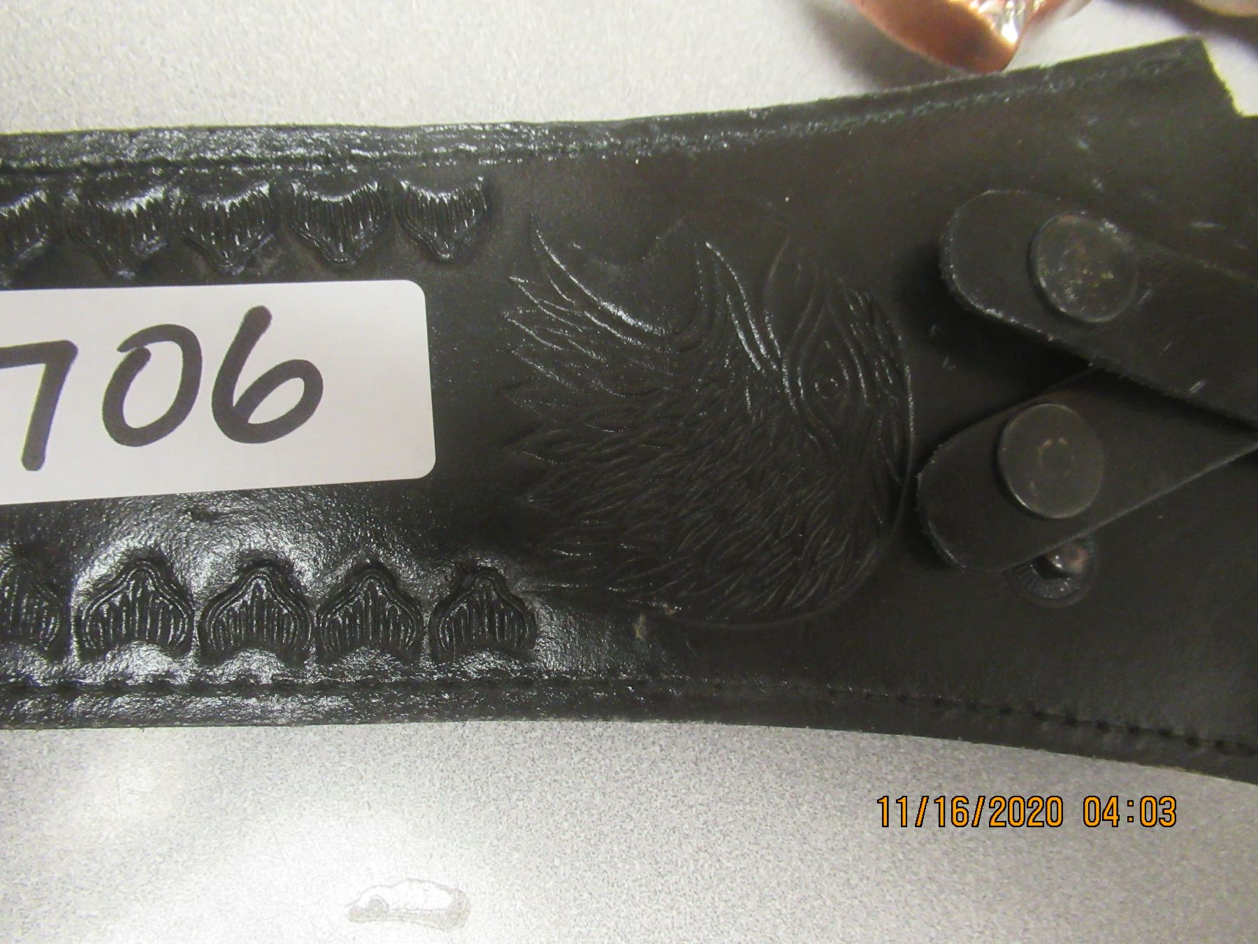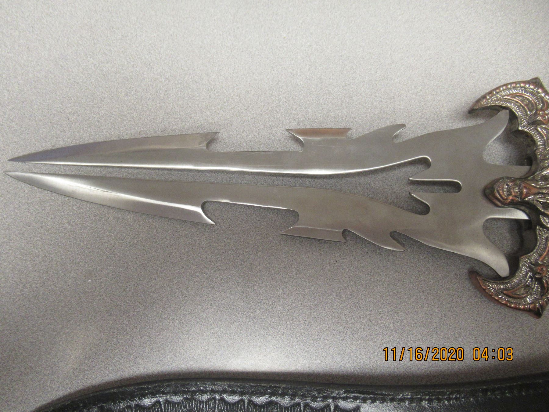 New Decorative (Sharp) Heavy 17"Long Knife w Leather Sheath- Very Heavy Handle w Skull & Demon Design