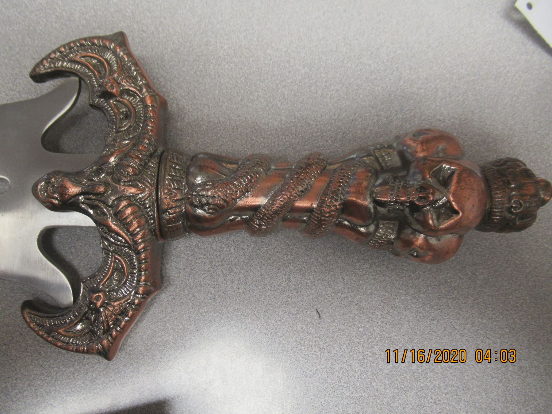 New Decorative (Sharp) Heavy Knife 17" L w Leather Sheath- Very Heavy Handle w Skull & Demon Design