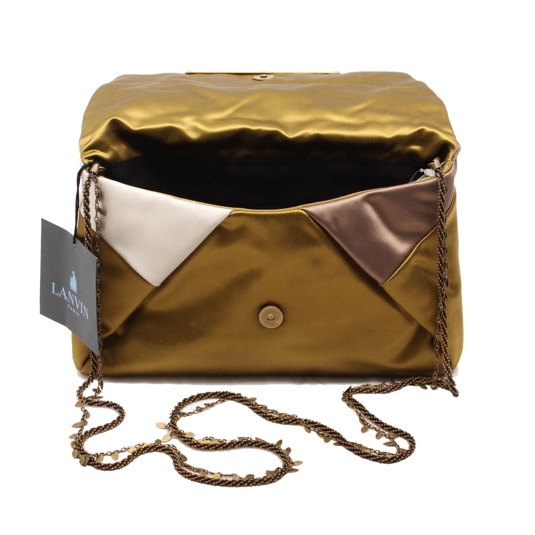 One Gorgeous cream, taupe, black and olive green patchwork satin clutch with hidden chain strap by Lanvin. Retails for $985, sold out. Comes with original dust bag. Measures 9.5 inches by 6 inches.