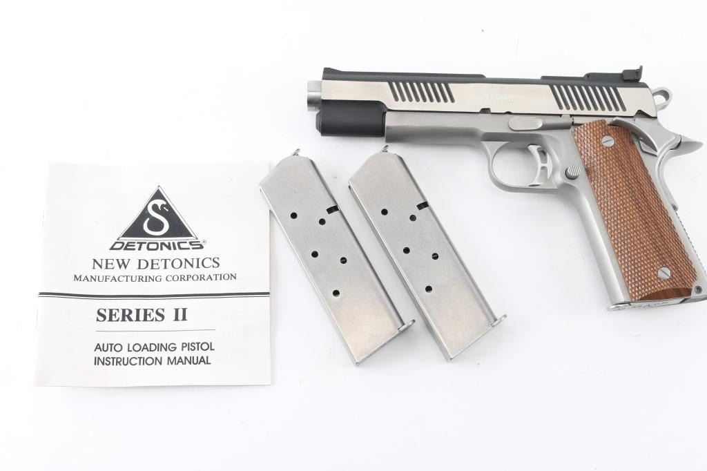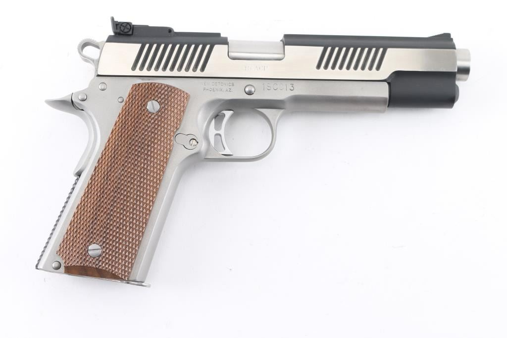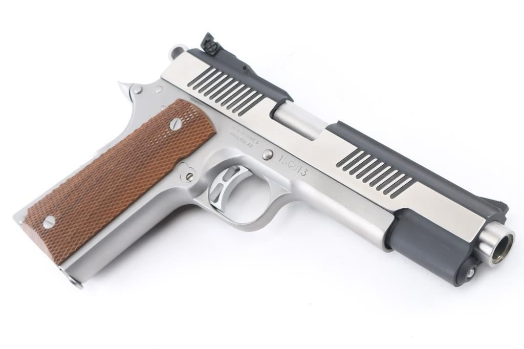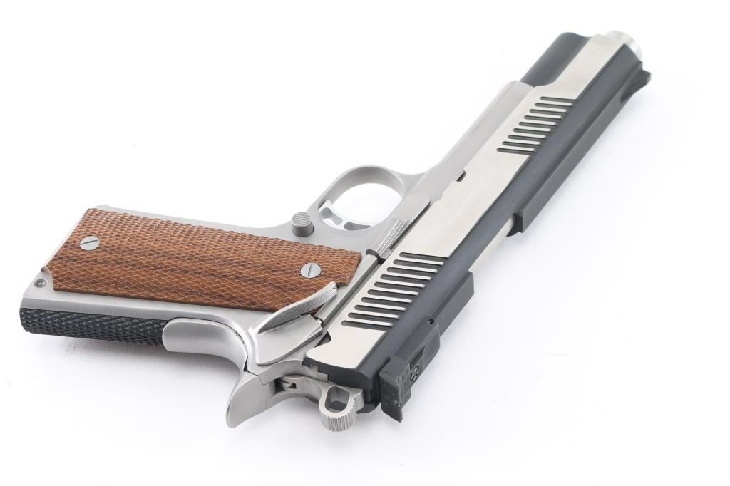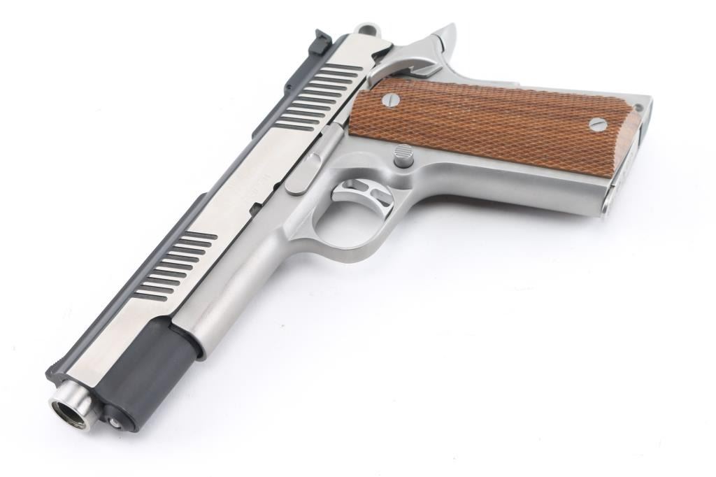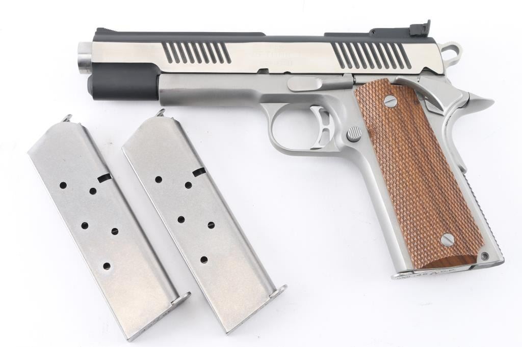 Stainless steel semiautomatic 1911 type pistol. Two tone color scheme with blackened slide, bright polished flats on sides of slide, matte finished frame. Features 5.25 " barrel (extends slightly from front face of slide), standard length frame, bushing less design, full length recoil spring guide, extended thumb safety and pushbutton magazine release, upswept beavertail grip safety, flat checkered black polymer mainspring housing, fixed ramp front sight, fully adjustable rear sight, checkered wood grips. Condition is like new with few minor signs of handling. Includes manual, three magazines. Condition is NRA Excellent *** Modern Firearm ***