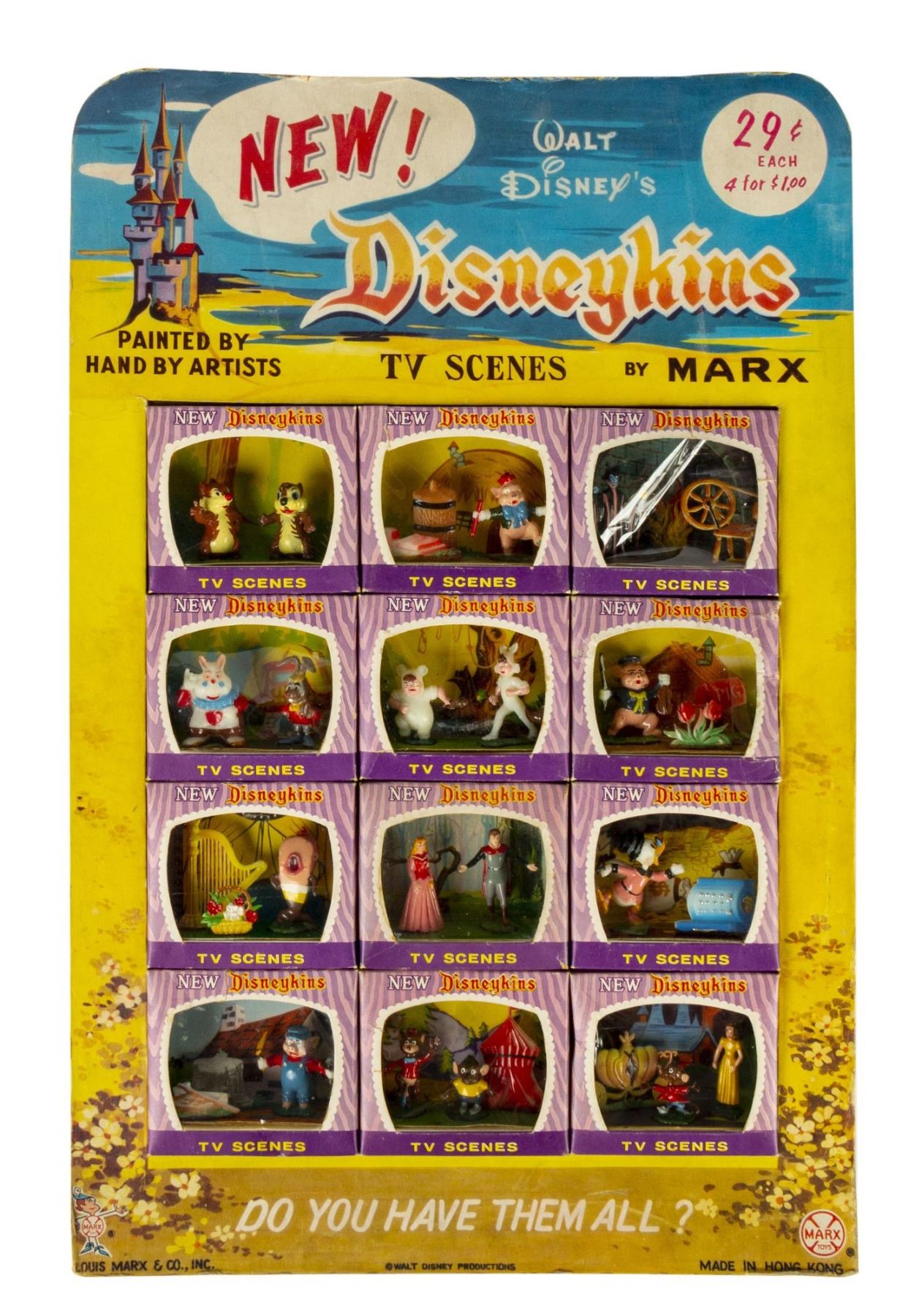 (Marx, c.1961) A very rare second series New Disneykins "TV Scenes" store display by Marx. This complete store display includes all (12) boxed hand-painted Disneykins in their various scenes as well as the original cardboard display frame. Each of the individual boxes resembles a television set from the era and has a protective cellophane front panel, which the individually sold scenes did not have. The display measures 18.5"x11.25" and is in very good condition with expected wear to the display frame from age and use.