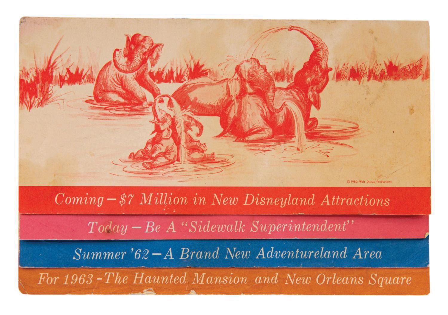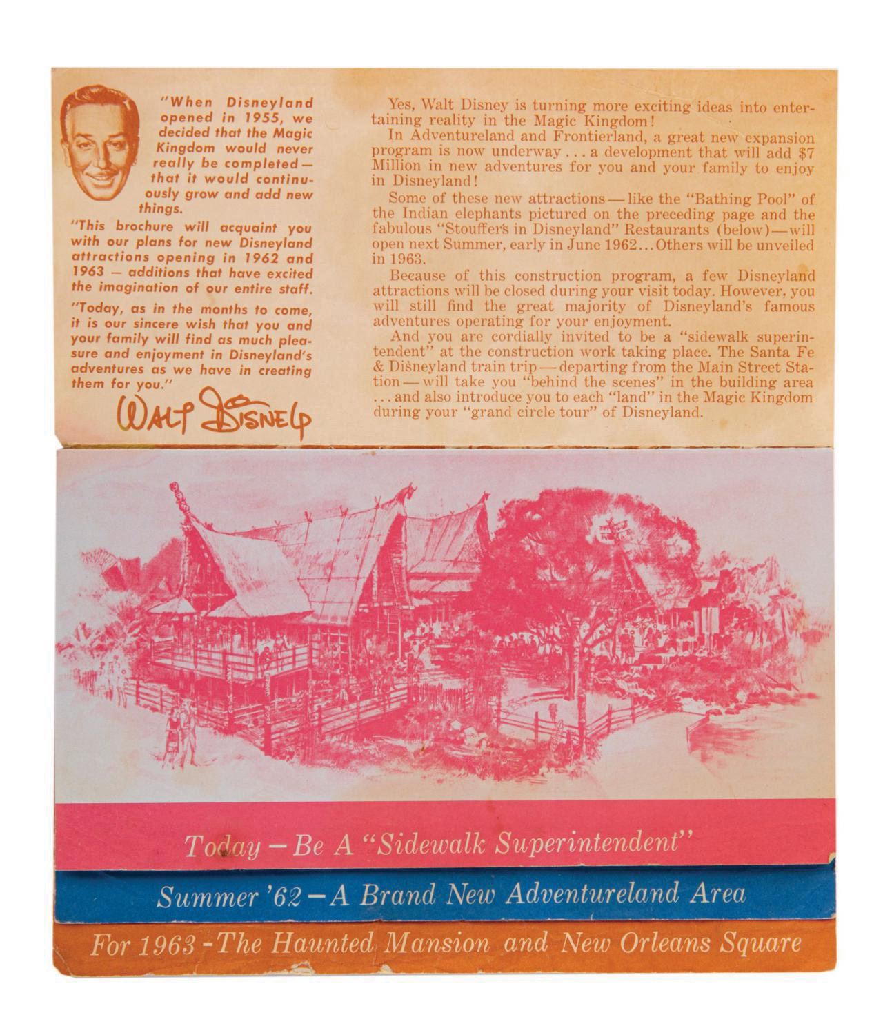 (Disneyland, 1962) A rare brochure featuring information and concept art for the $7 million in new Disneyland attractions that were under construction in 1962. It flips up in 4 sections to discuss the Swiss Family Treehouse, Haunted Mansion, and the new Adventureland area. Measuring 5"x7.5", the brochure is in good condition, with wear and creasing to edges and minor color fading throughout.
