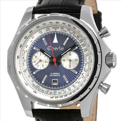 Brand New Eberle men's stylish sport CHRONOGRAPH style shaped watch in excellent new condition with date, month, weekday and seconds dials; stainless case and leather band; box and papers; 21 JEWELS; retail $2595