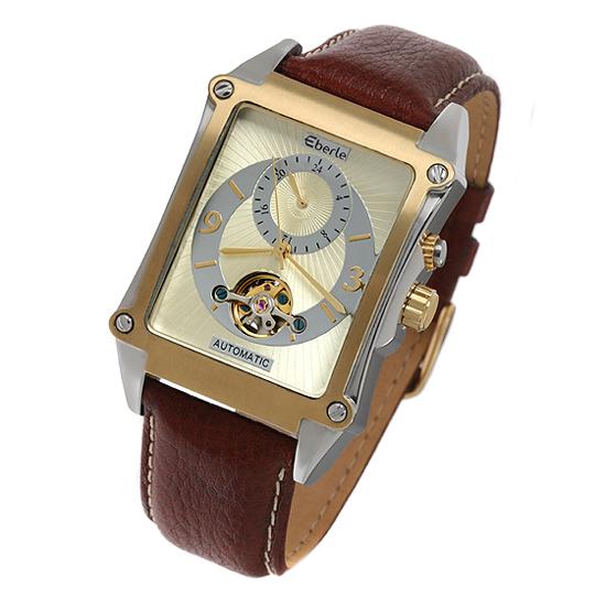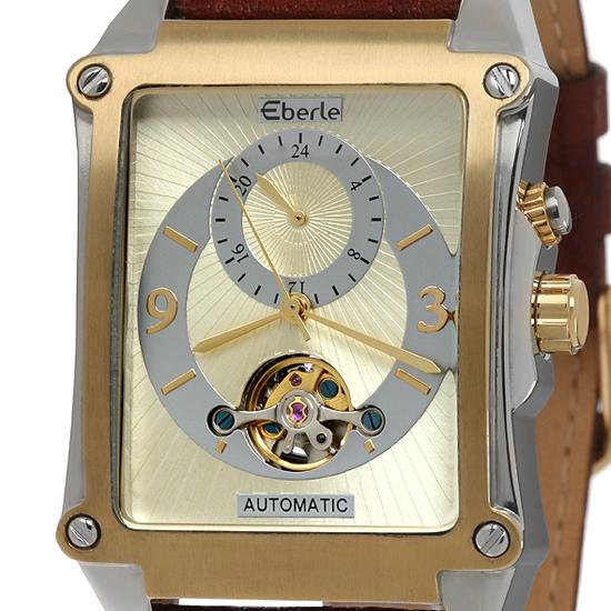 Brand New Eberle men's stylish sport style tank shaped watch in excellent new condition with leather band and 24 dial as well as exposed balance wheel; stainless case; box and papers; retail $2595