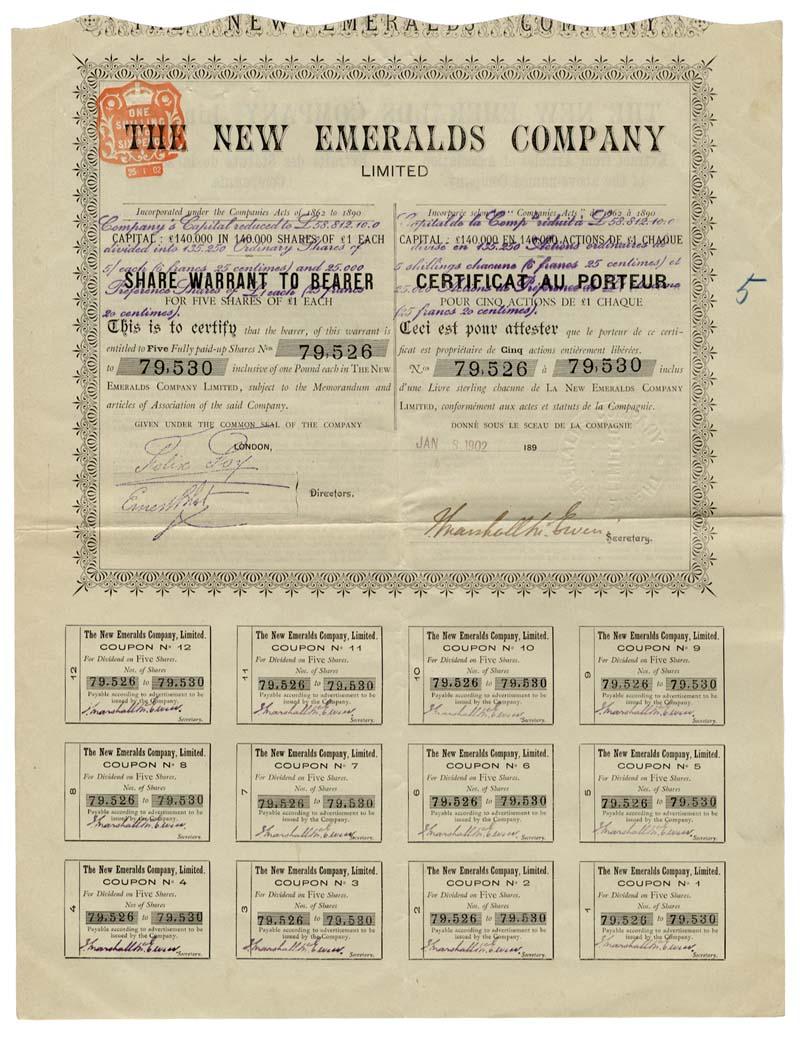 1902, London. Certificate for 5 shares with complete coupons attached below. Black/Olive. Uncancelled and very fine with a scalloped top edge.
