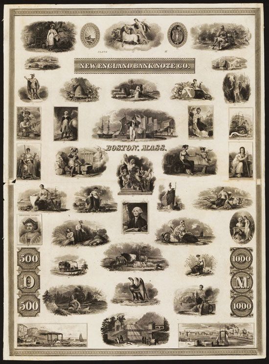 Boston, Massachusetts, ND (ca.1830's), 10.5 x 14.5 inch advertising sheet with numerous vignettes, Title of company at top, portraits of notables, presidents, Columbus, Washington, 2 end counters for Ò500Ó and Ò1000Ó, Native Americans, agricultural scenes, allegorical women and men and numerous other scenes. Printed in black on india paper, Plate II with vignettes numbered from 1 to 41, the sheet had been folded for storage horizontally in the middle, there are 2small pin holes and a small 1/2 inch tear on the middle left margin, otherwise the sheet is in XF condition, Extremely rare and attractive Proof vignette sheet. NEBNC.