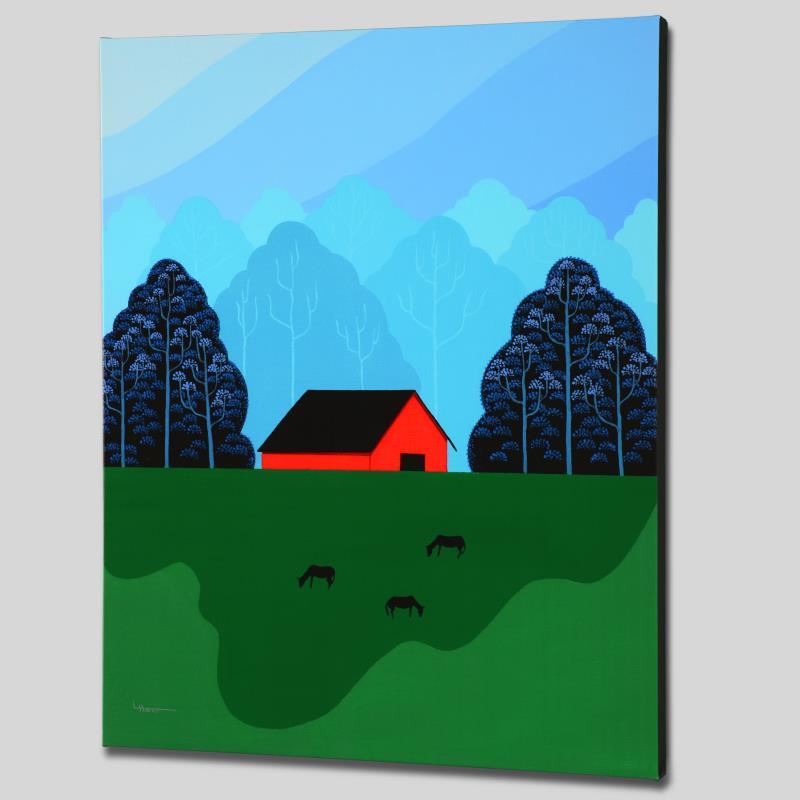 Larissa Holt, a student of distinguished artist Eyvind Earle(1916-2000), uses bold colors and breathtaking scenery to create images of Nature in her own unique style. "New England Barn" is a limited edition giclee on stretched canvas by Holt, numbered and bearing Holt's authorized signature. This piece comes gallery wrapped. Includes Letter of Authenticity. Measures approx. 21.5" x 27" x 1.5" (image).
